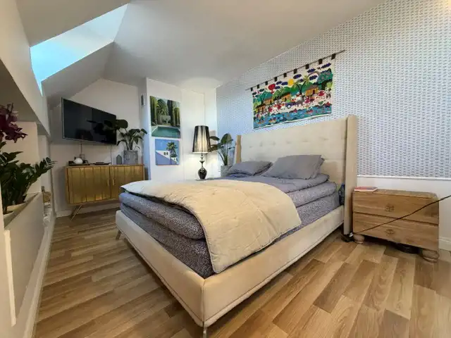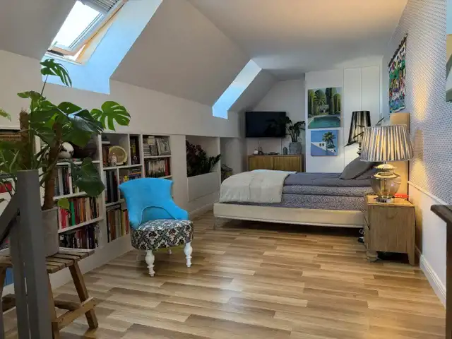 Nieruchomość wyróżnia się dużą przestrzenią, bardzo wysokim sufitem (aż 403 cm w najwyższym punkcie) oraz funkcjonalnym układem pomieszczeń. Dzięki temu mieszkanie jest jasne, przestronne i ma wyjątkowy charakter. Powierzchnia mieszkania według księgi wieczystej wynosi 79,21 m², natomiast powierzchnia po podłodze przekracza 100 m², co daje znacznie większą przestrzeń użytkową.