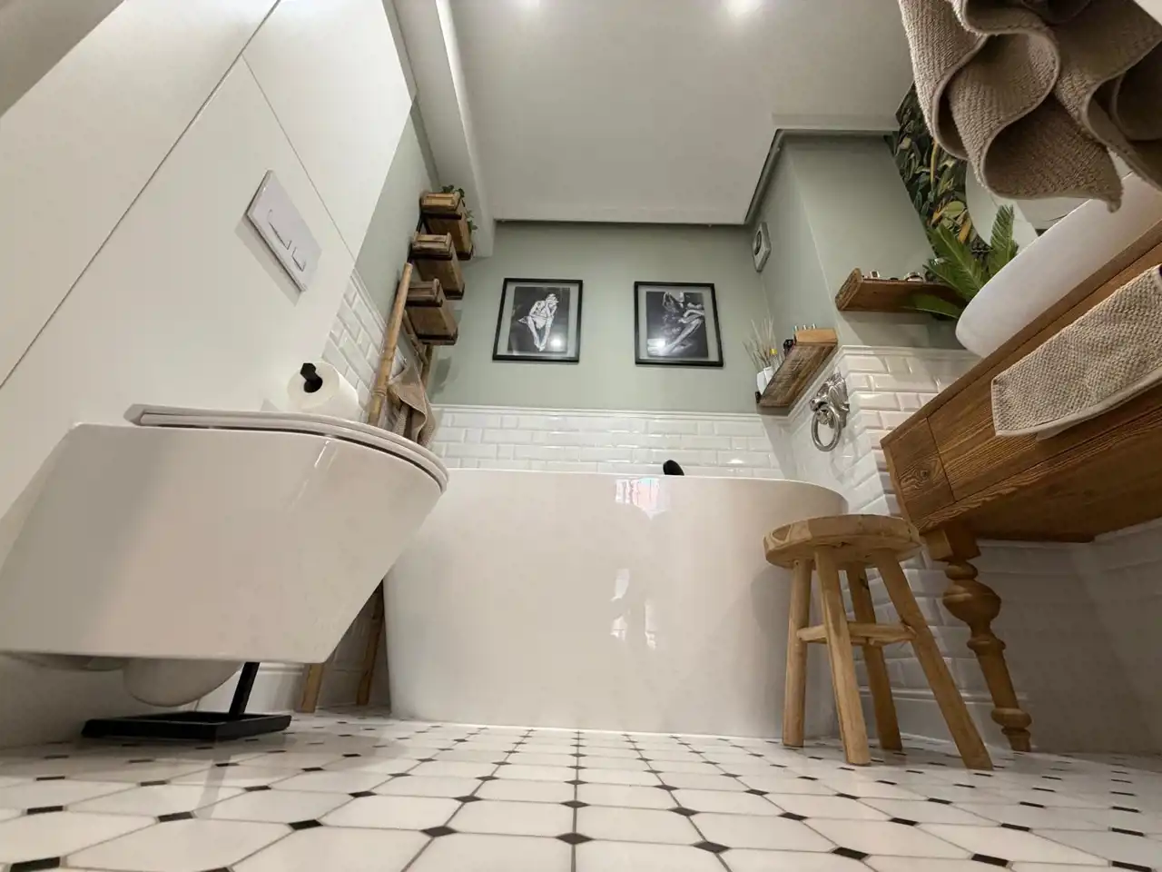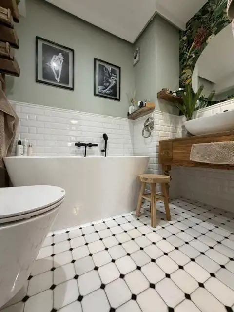 - Łazienka po remoncie w 2022 r. z kamienną mozaiką Dunin i meblem z drewna z odzysku