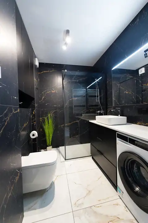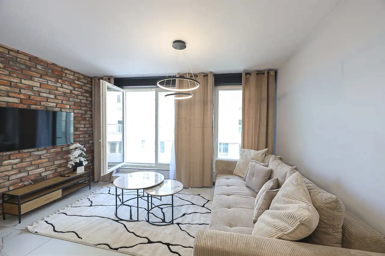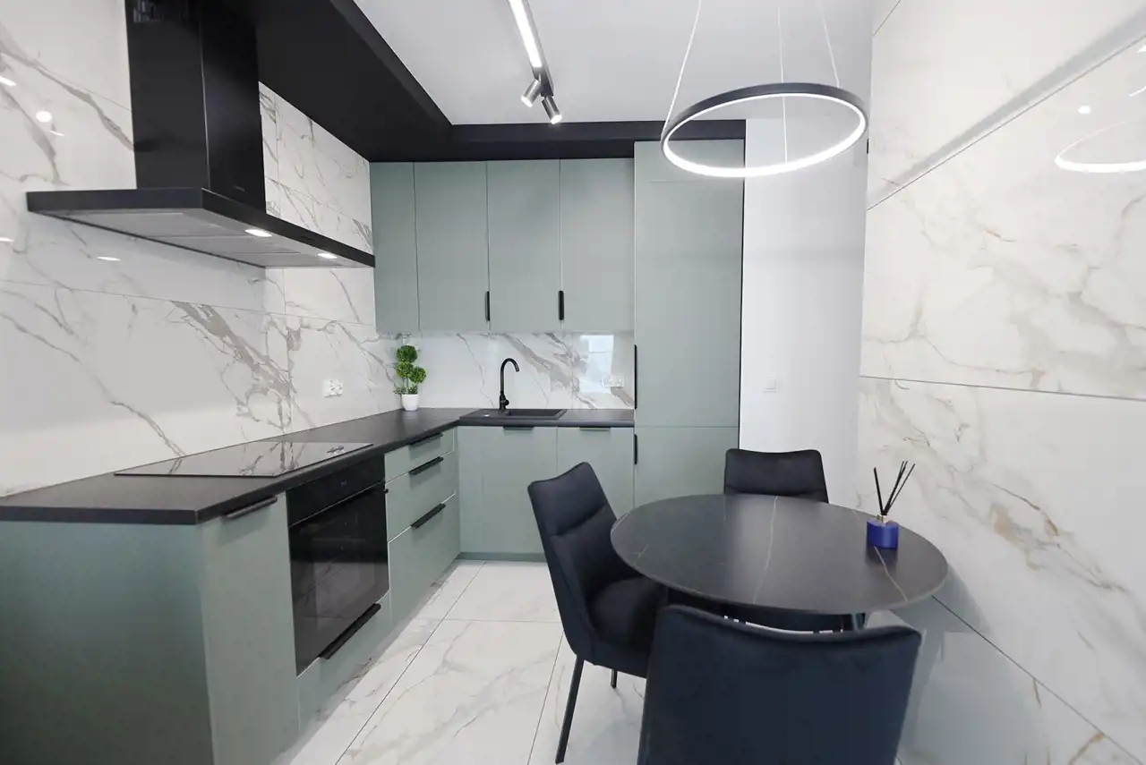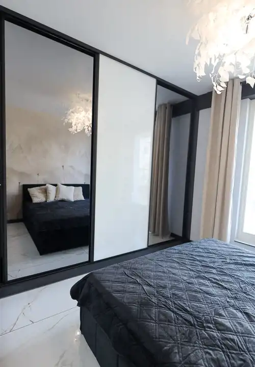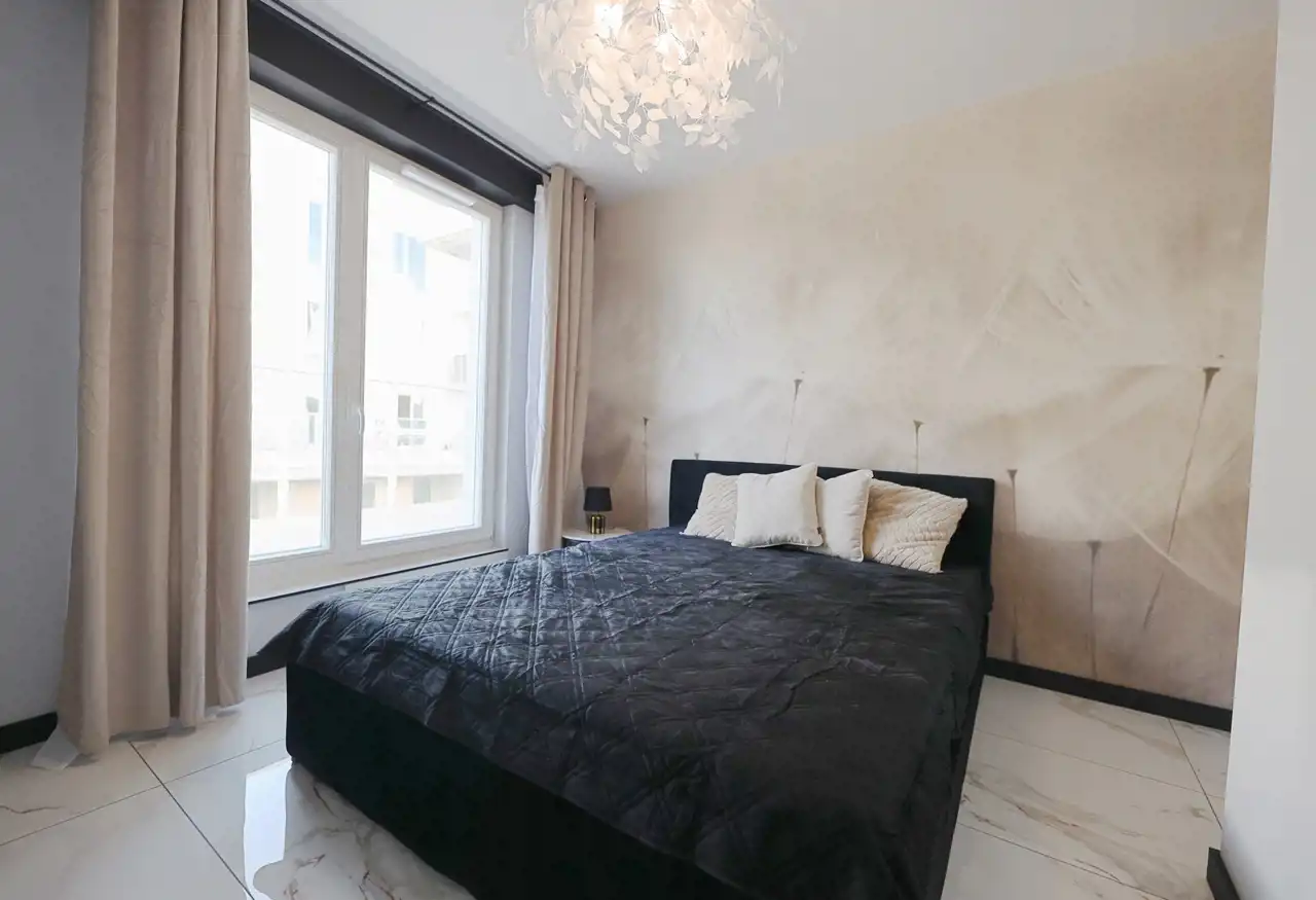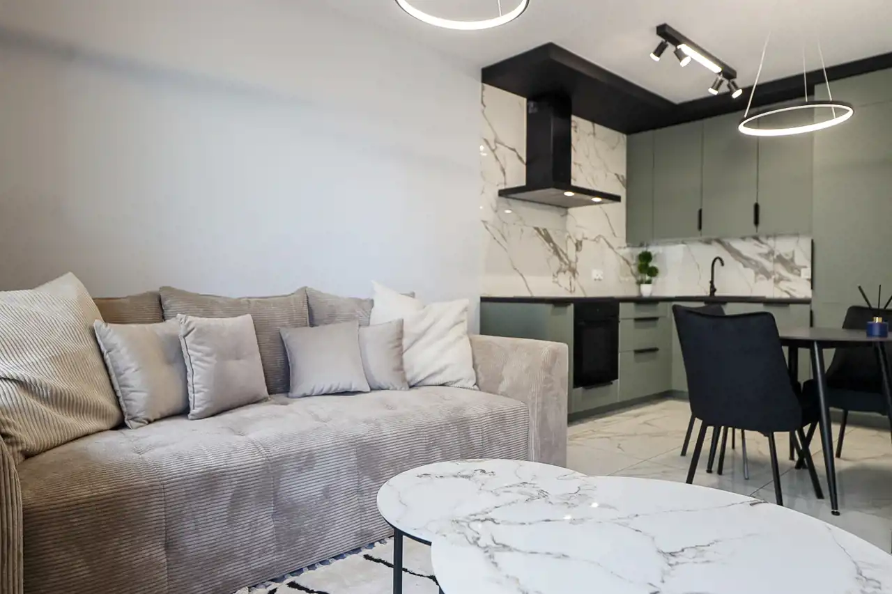 Apartament został urządzony w nowoczesnym, eleganckim stylu, z wykorzystaniem wysokiej jakości materiałów i spójnej kolorystyki.