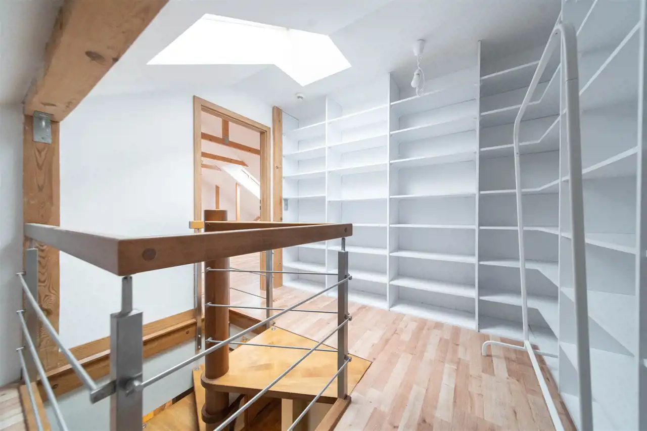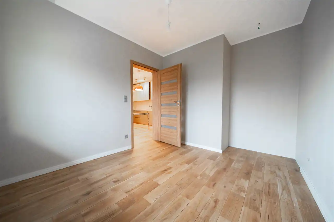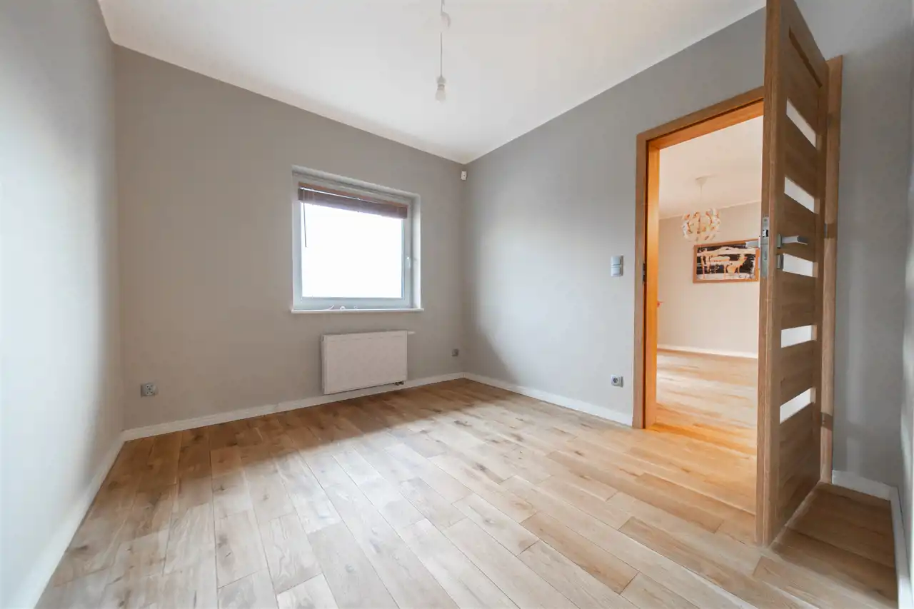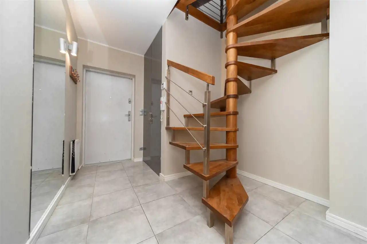 Mieszkanie wykończone w wysokim standardzie, z dbałością o detale i funkcjonalność. Dębowa podłoga oraz schody, nowoczesne oświetlenie, kuchnia wykonana na zamówienie, instalacja alarmowa. Zabudowy stałe – w przedpokoju oraz sypialni głównej – również robione na wymiar.