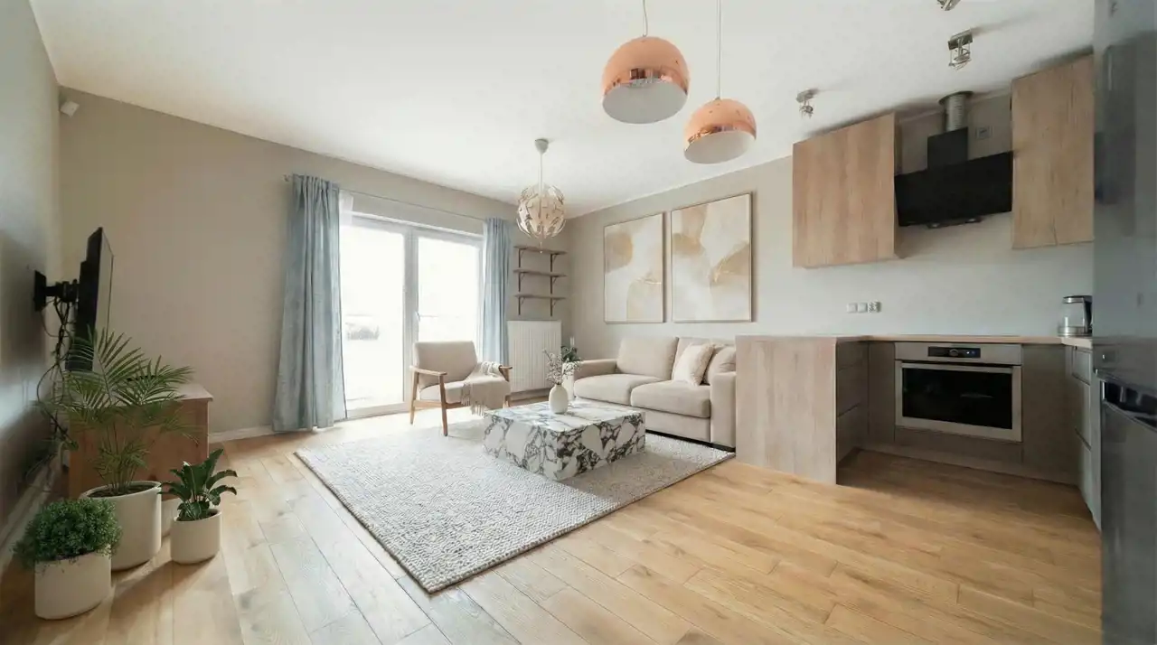 - salon z aneksem kuchennym i wyjściem na taras