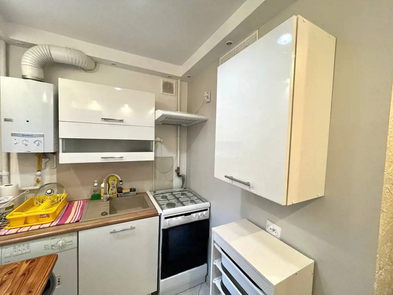 Kuchnia widna, wyposażona w lodówkę, zmywarkę, kuchenkę gazową oraz pralkę.