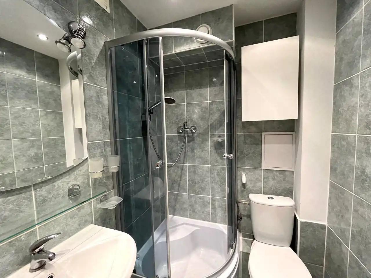 Łazienka z kabiną prysznicową i WC.