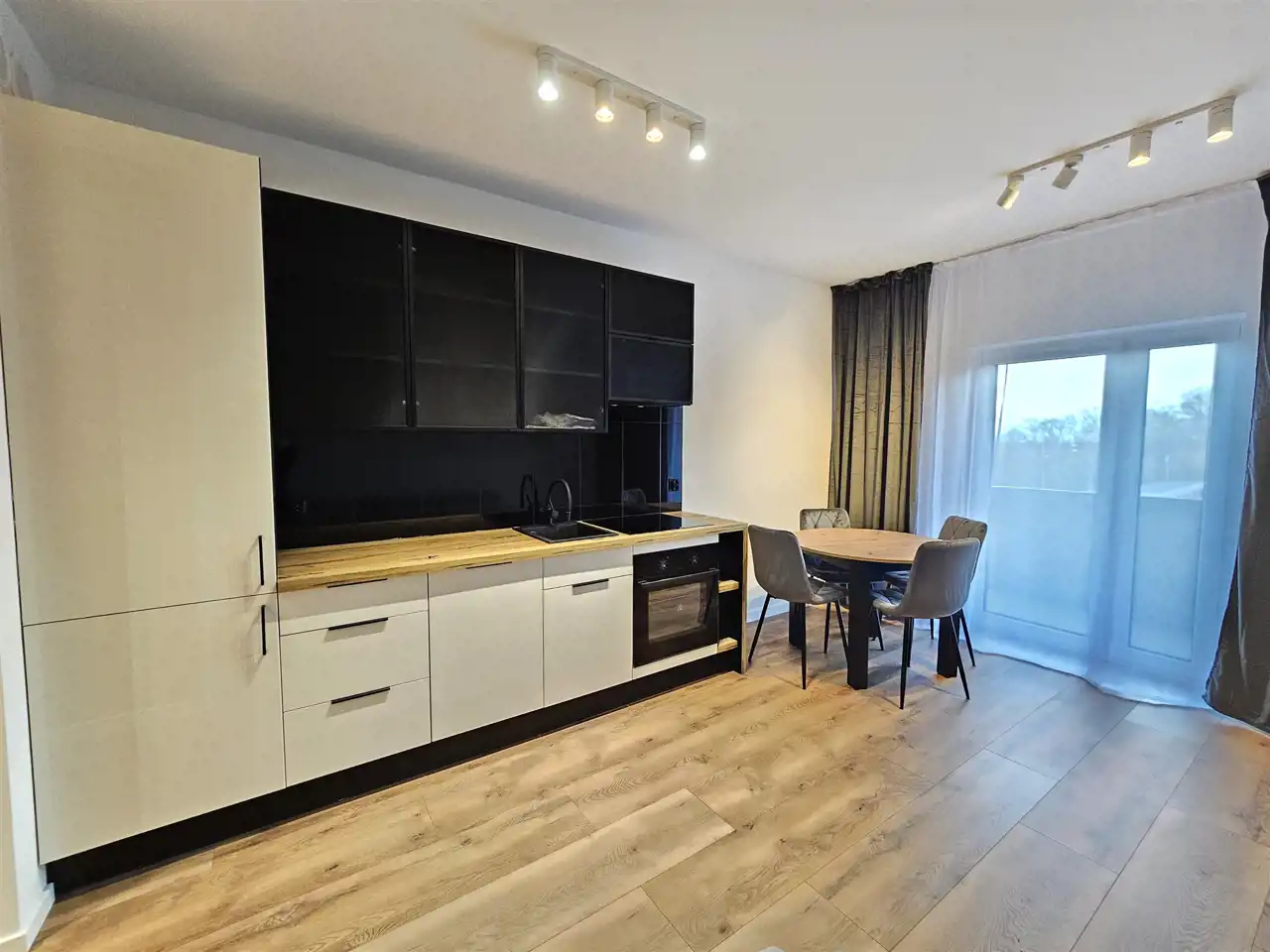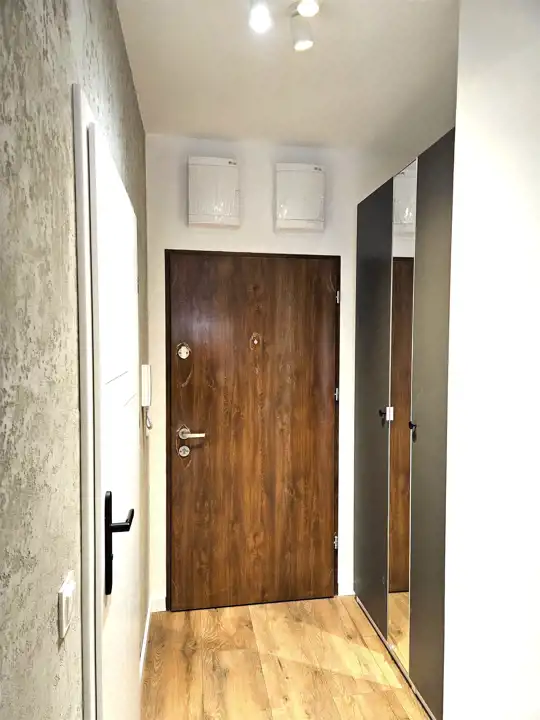 Składa się z dużego pokoju z aneksem kuchennym, łazienki z WC oraz holu z szafą. W mieszkaniu ściany wygładzone i pomalowane. Łazienka w nowoczesnej glazurze i terakocie. Mieszkanie jest w umeblowane i wyposażone w sprzęt AGD i RTV: pralkę, zmywarkę, lodówkę płytę indukcyjną, piekarnik, pochłaniacz oraz telewizor. Ogrzewanie i ciepła woda z sieci miejskiej.