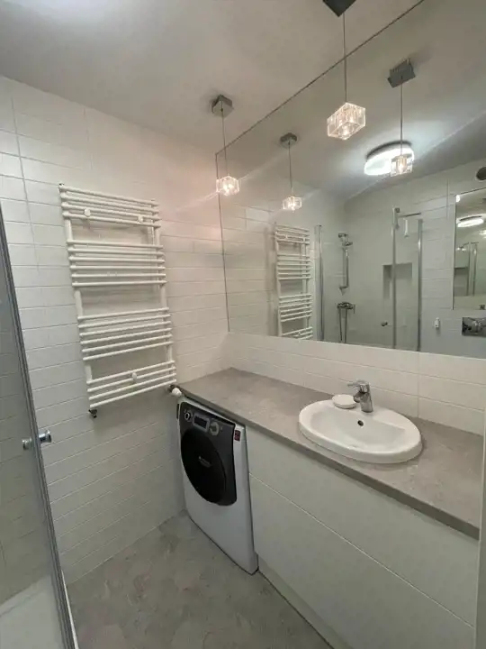 - łazienka z toaletą wyposażona w pralkę,