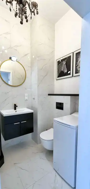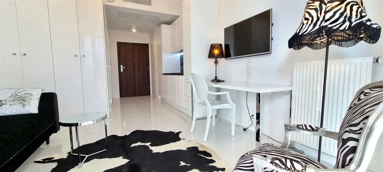 Klimatyzowany apartament składa się z eleganckiego pokoju dziennego z aneksem kuchennym, nowocześnie zaaranżowanej łazienki z WC oraz obszernej loggii.