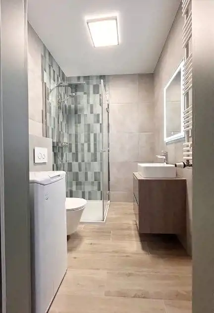 - Kuchnia z nowoczesnym sprzętem AGD: lodówka, płyta indukcyjna, zmywarka, piekarnik