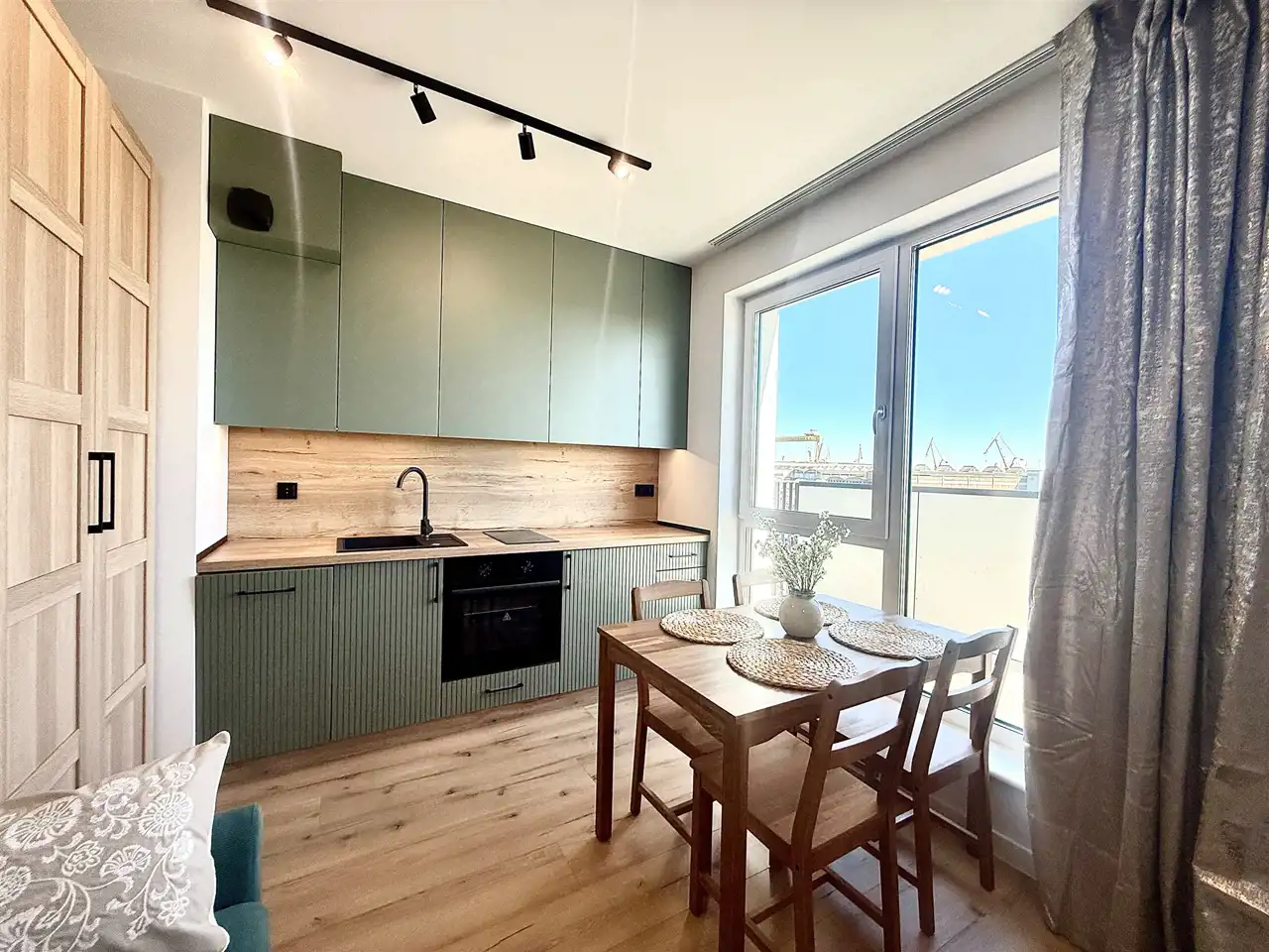 Mieszkanie jest całkowicie wyposażone w nowoczesne sprzęty o wysokiej klasie energetycznej i meble na wymiar. Znajdziemy w nim m.in.: