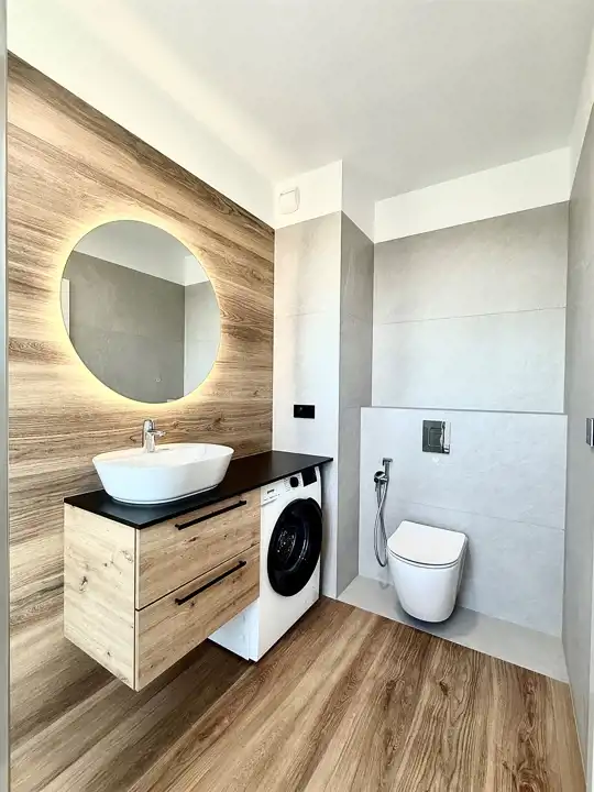 - w pełni wyposażoną kuchnię: lodówka, zmywarka, piekarnik, płyta indukcyjna, duża ilość szafek do przechowywania