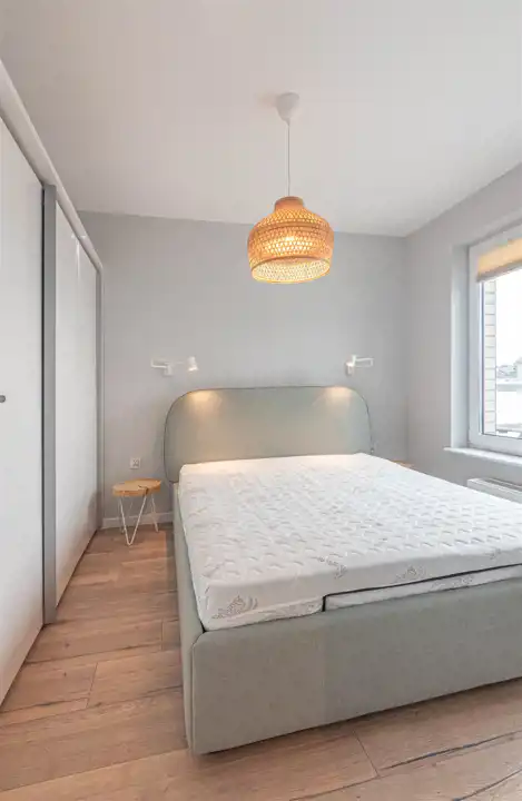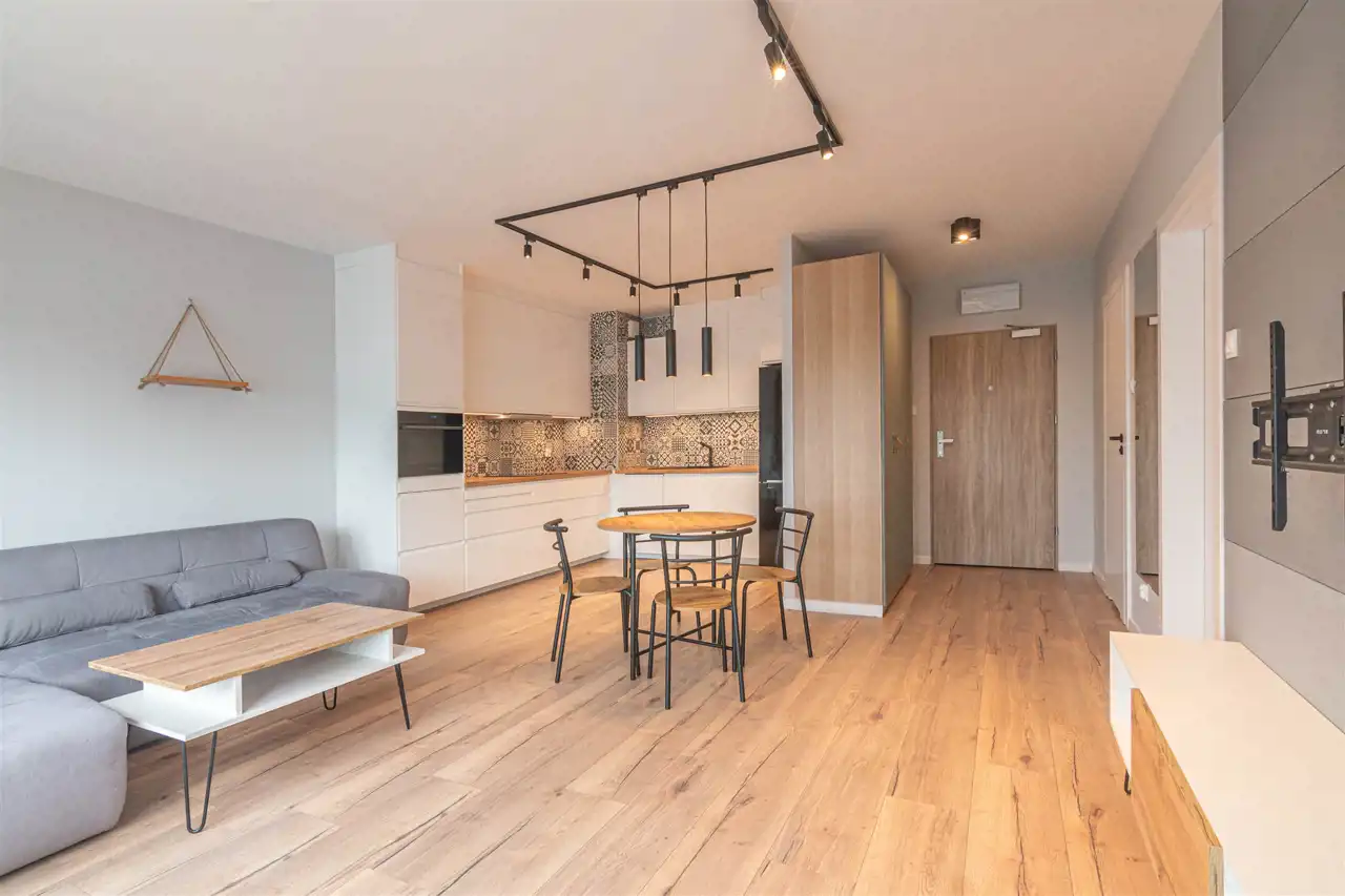 Mieszkanie położone na czwartym piętrze niskiego budynku z 2022 roku. Lokal w bardzo dobrym standardzie: ściany gładzone - malowane, na podłodze panele, okna PCV. Pokój dzienny umeblowany. W sypialni duże łóżko i szafa w zabudowie. Kuchnia w formie aneksu, umeblowana i wyposażona w sprzęt AGD (płyta indukcyjna, piekarnik z funkcją mikrofali, zmywarka, okap, lodówka z zamrażarką).W przedpokoju kolejna szafa. Łazienka razem z wc, wanna, zasłona prysznicowa, pralka.