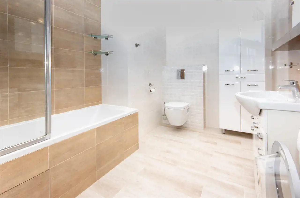 W przedpokoju komoda oraz duża szafa w zabudowie. Łazienka z wanną , wyposażona w pralkę, szafkę .