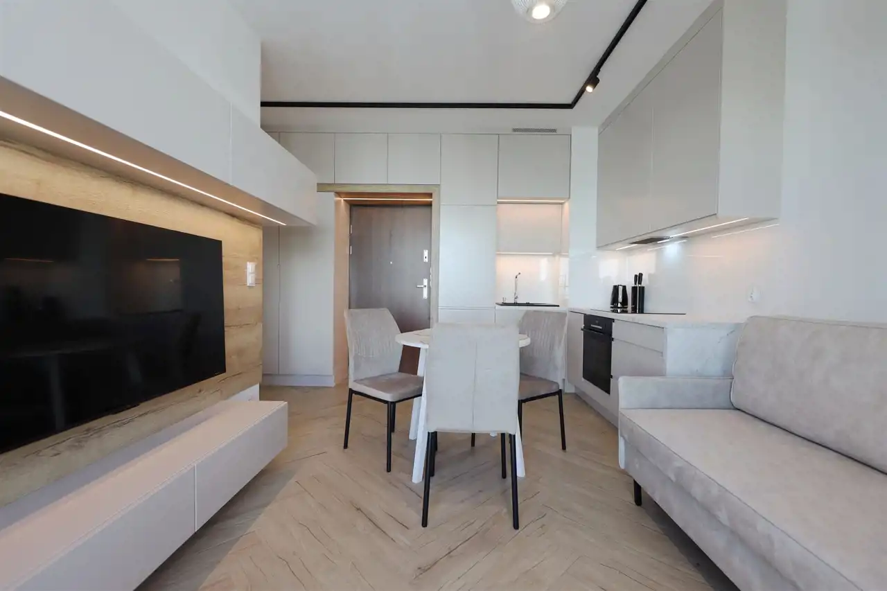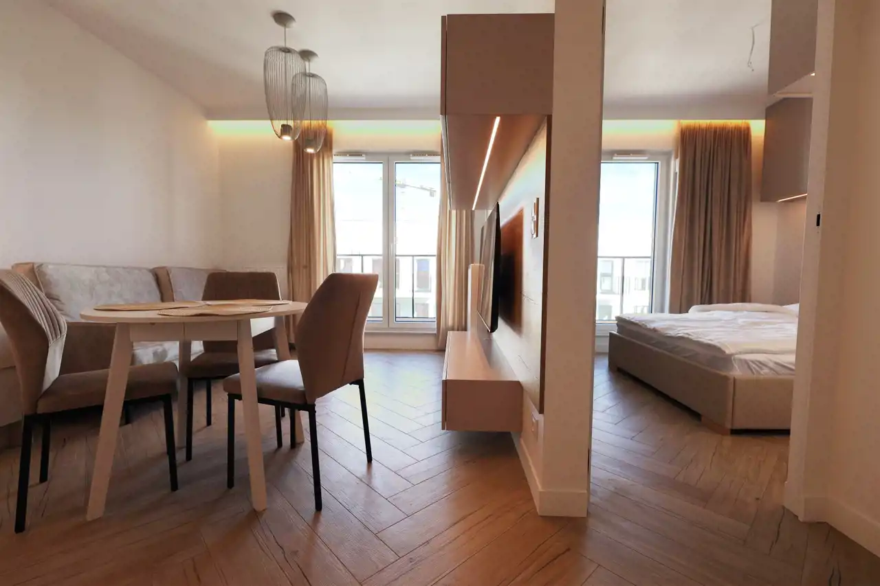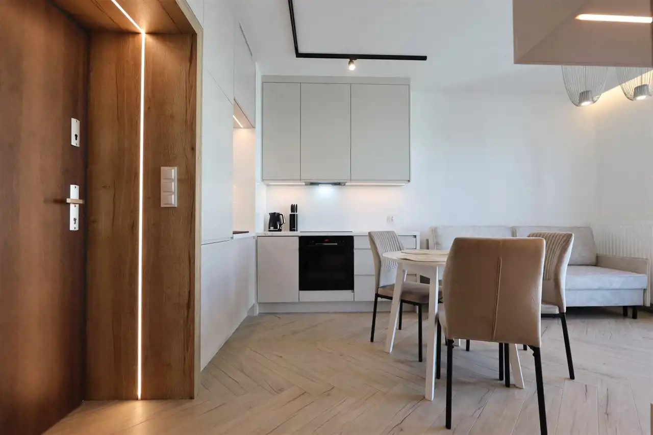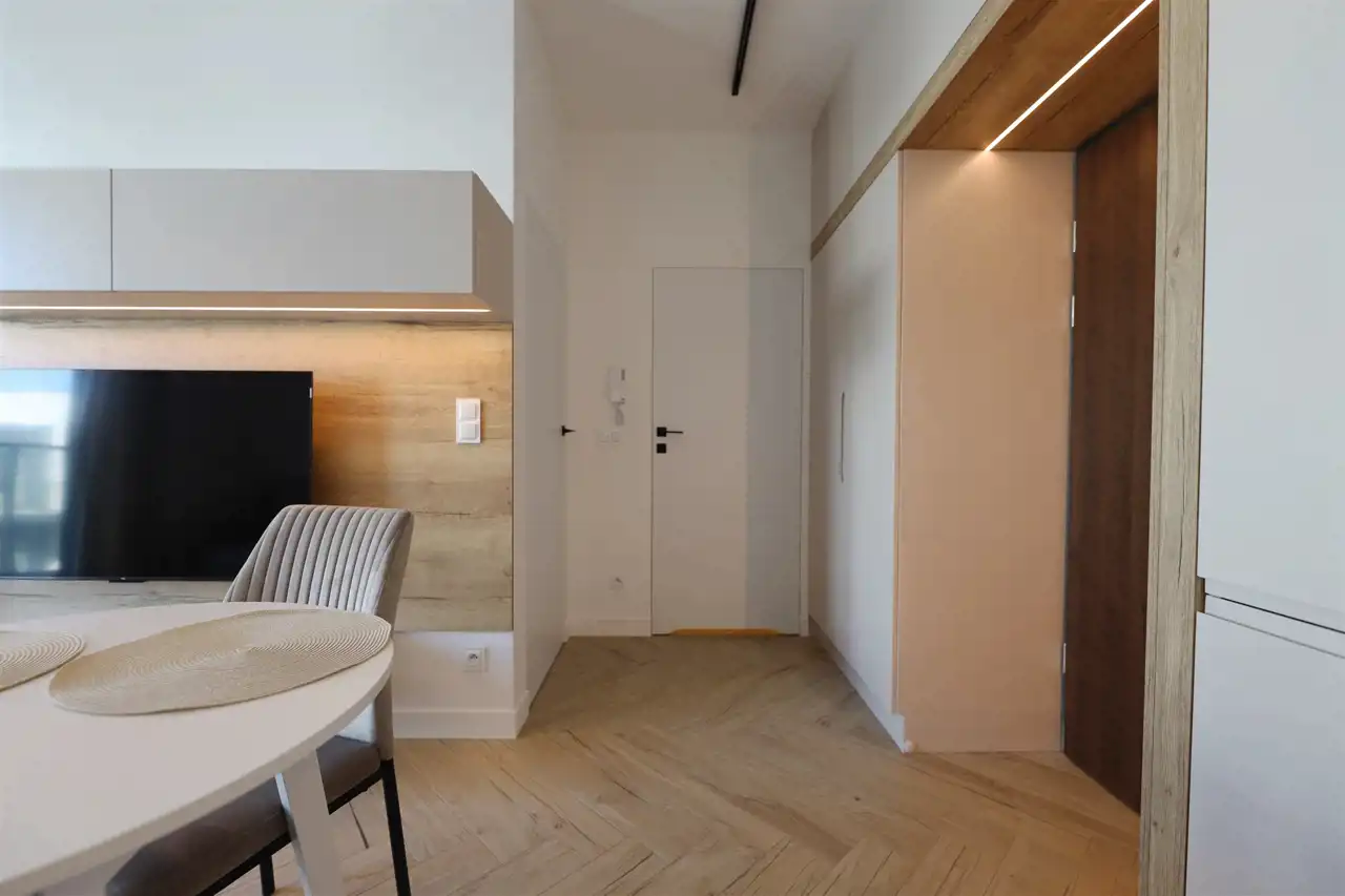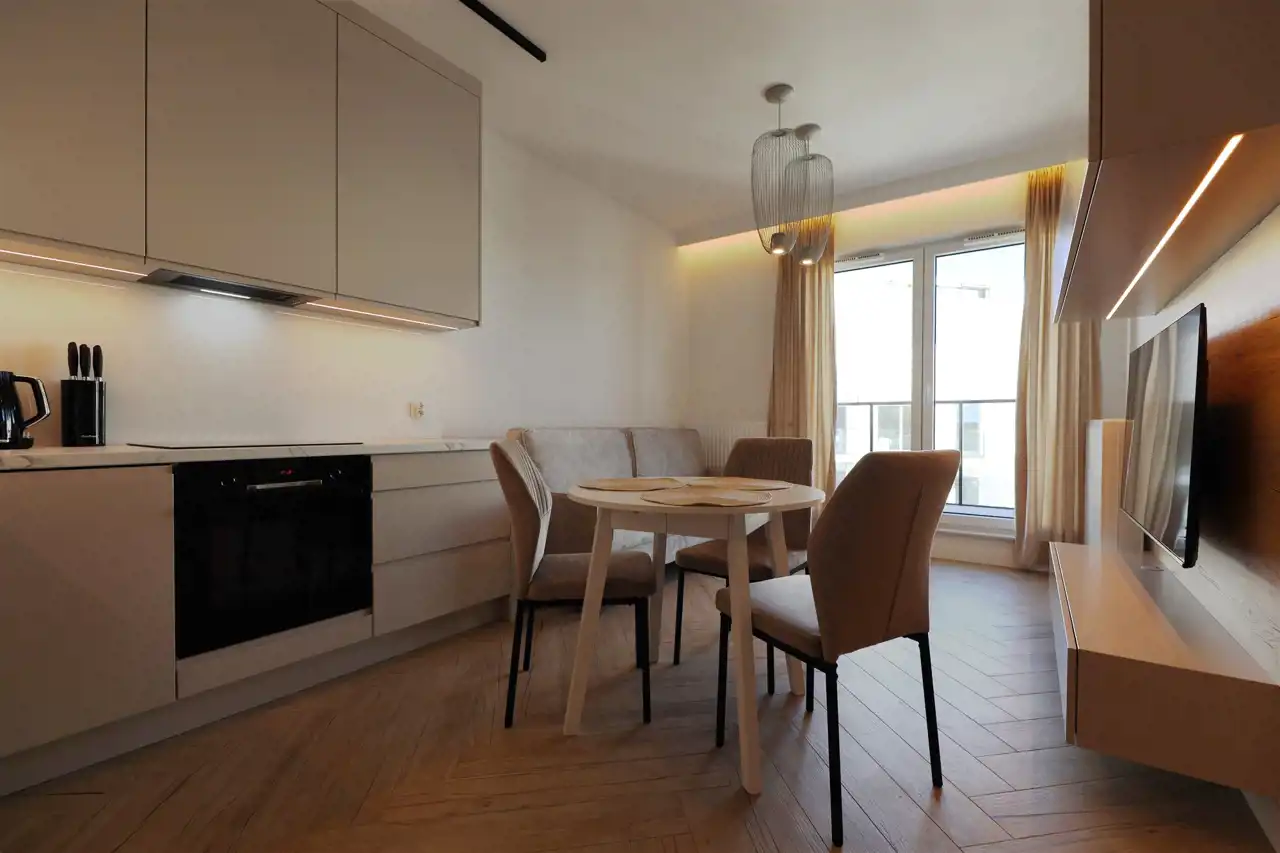 Wyposażenie: mieszkanie w pełni urządzone, wyposażone we wszystkie niezbędne sprzęty AGD (lodówka, zmywarka, piekarnik, płyta indukcyjna, pralka).