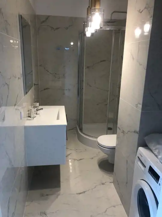 Kuchnia jest w pełni wyposażona – znajdziemy tu lodówkę, zmywarkę, piekarnik, płytę indukcyjną oraz komplet naczyń. W salonie znajduje się wygodna sofa i telewizor, tworzące idealną przestrzeń do relaksu.
