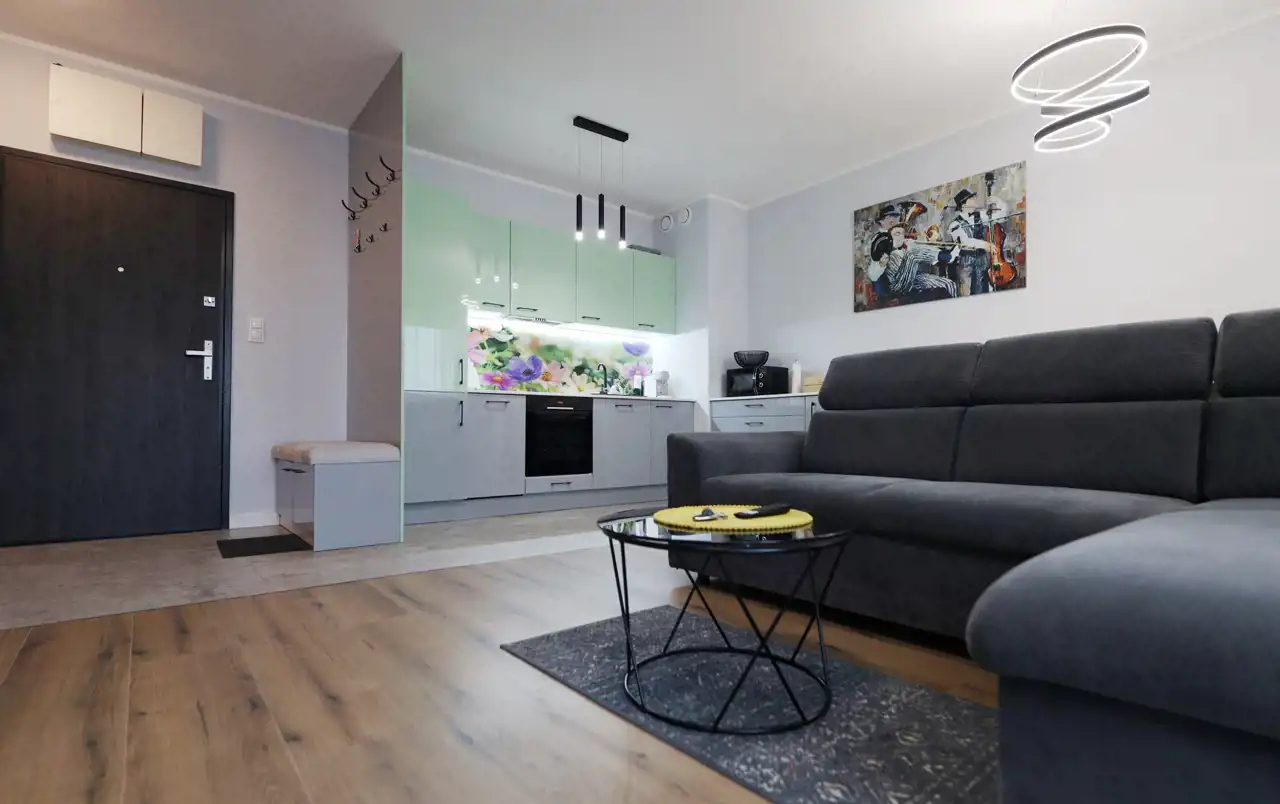 - Elegancki salon z rozkładaną sofą dla dwóch osób oraz aneksem kuchennym