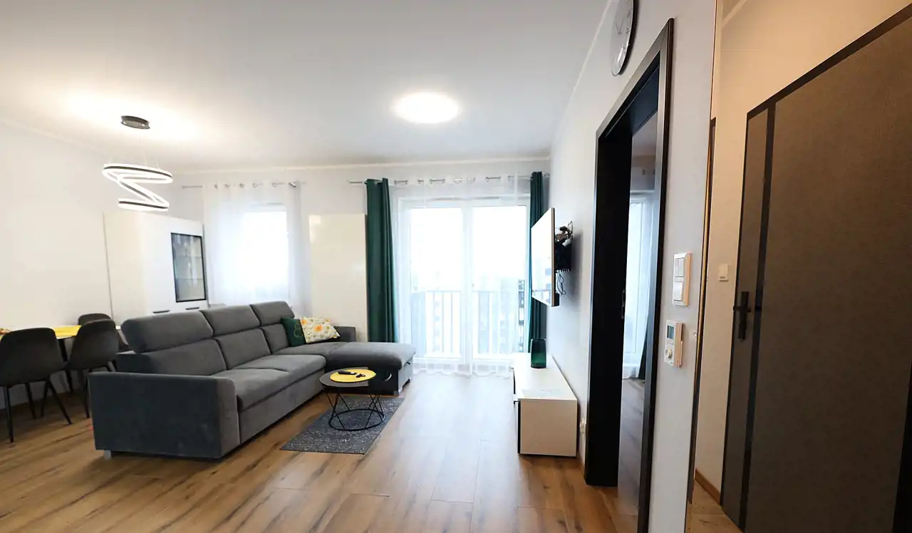 Ofertą najmu jest nowoczesny, dwupokojowy apartament o powierzchni 47 m², usytuowany na szóstym piętrze nowoczesnego budynku z windą, w samym sercu miasta. Dodatkowym atutem jest przynależne miejsce parkingowe w podziemnym garażu do wynajęcia