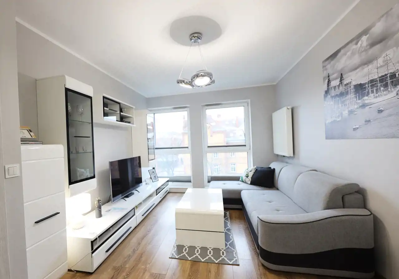 - Elegancki salon z rozkładaną sofą, nowoczesną meblościanką oraz aneksem kuchennym, oddzielonym przesuwnymi szklano-mlecznymi drzwiami.