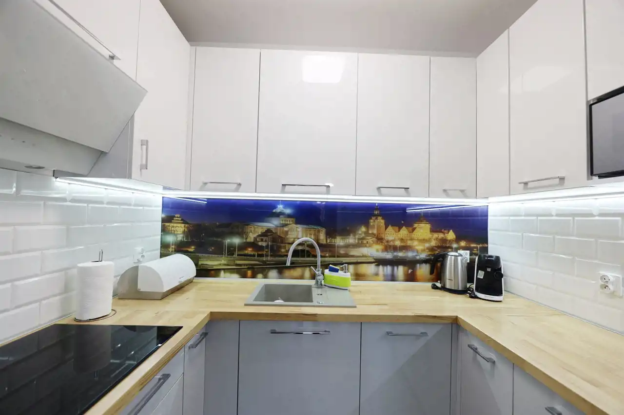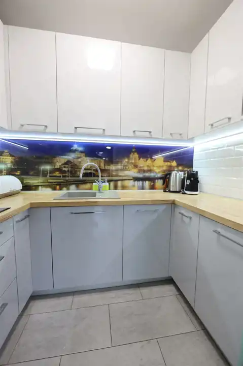 Mieszkanie charakteryzuje się dużymi, podłużnymi oknami, które oferują przepiękny widok na panoramę miasta. Wbudowane plisy średnio przezierne skutecznie blokują nadmiar promieni słonecznych, zapewniając komfortowe oświetlenie przez cały dzień.