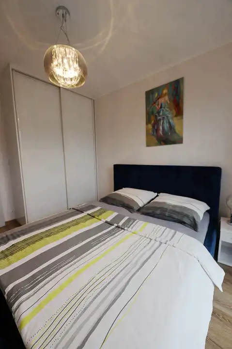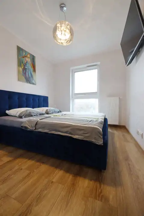 - Przytulna sypialnia wyposażona w małżeńskie łóżko, telewizor oraz pojemną szafę.