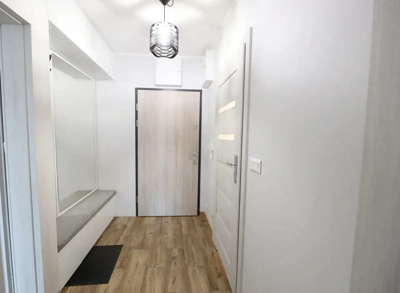 - Przedpokój z przestronnymi szafami oraz dużym lustrem, co zapewnia dodatkową funkcjonalność.