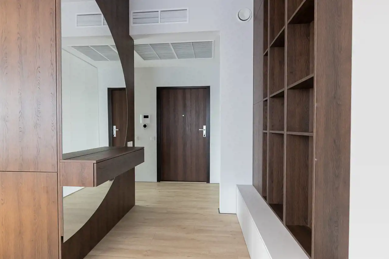 W mieszkaniu znajduje się wiele pojemnych szaf w zabudowie, co znacząco podnosi komfort codziennego użytkowania i pozwala na wygodne przechowywanie.