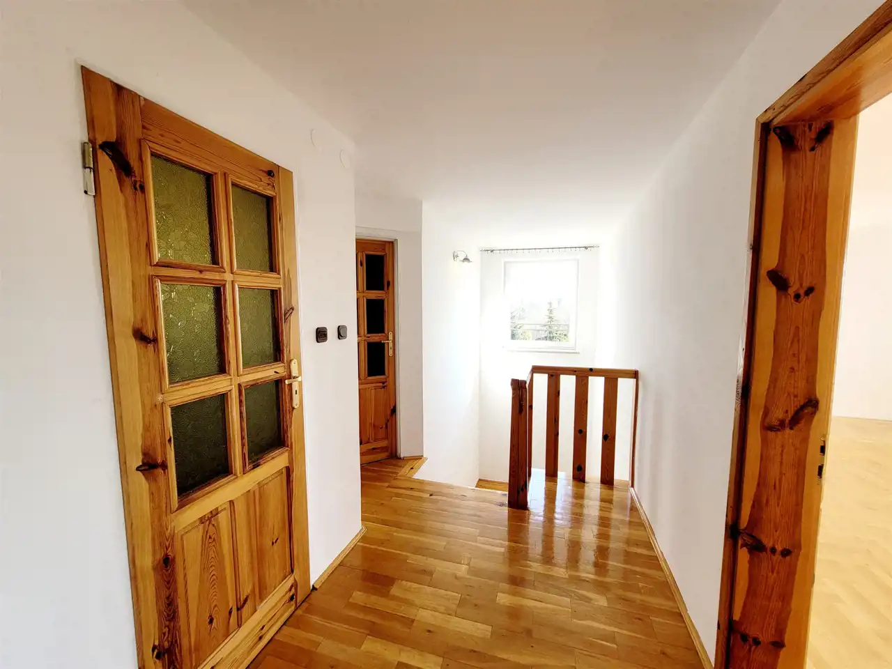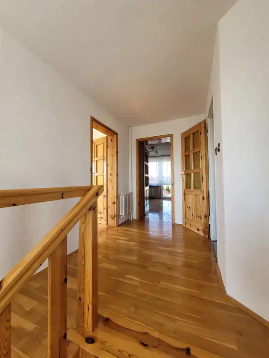 Na piętro prowadzą drewniane, wygodne schody. Na górnej kondygnacji urządzono strefę prywatną dla mieszkańców i znajdziemy tam dwa duże pokoje z balkonami ( możliwość przerobienia na 3), łazienkę, pralnię i przedpokój.