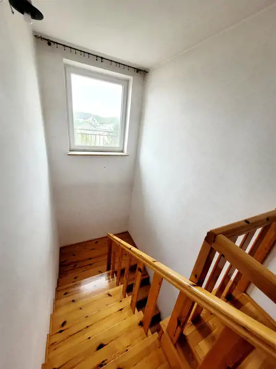 Na piętro prowadzą drewniane, wygodne schody. Na górnej kondygnacji urządzono strefę prywatną dla mieszkańców i znajdziemy tam dwa duże pokoje z balkonami ( możliwość przerobienia na 3), łazienkę, pralnię i przedpokój.