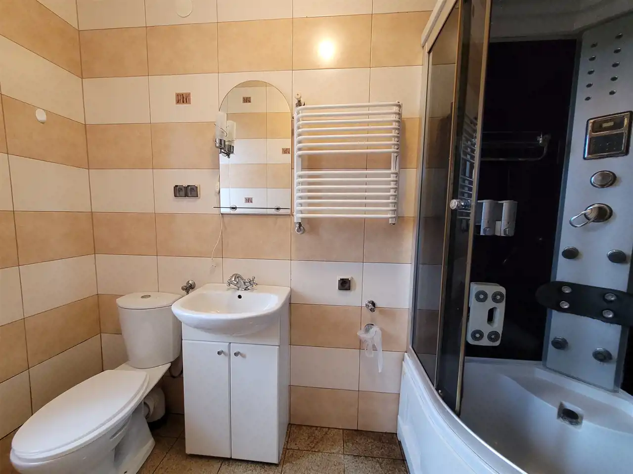 Poniżej znajduje się piwnica a w niej urządzono niezależne mieszkanie lub pomieszczenia do prowadzenia działalności gospodarczej: dwa pokoje, kuchnia, łazienka z wc i prysznicem. Dodatkowo na tym poziomie znajduje się garaż, który można przerobić na salon.
