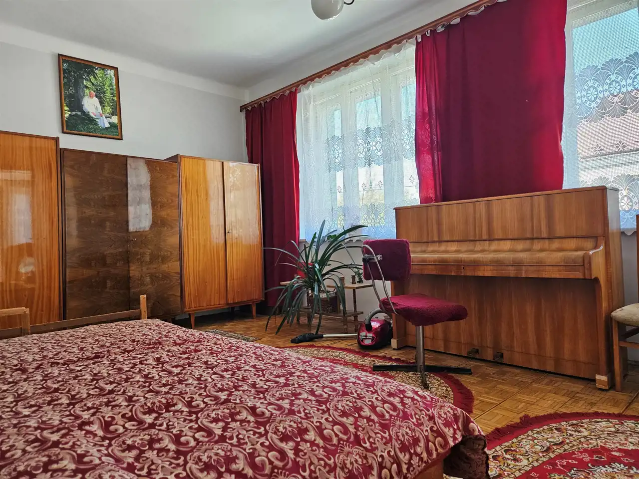 Piętro: 4 przestronne pokoje (największy 26 m²), kuchnia, spiżarka, łazienka, WC, przedpokój.
