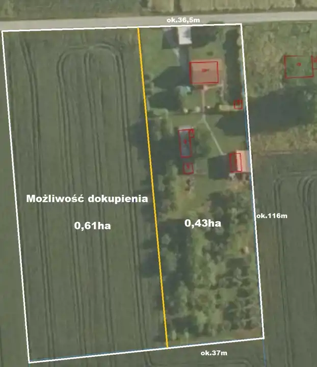 MOŻLIWOŚĆ ZAKUPU BUDYNKÓW Z MNIEJSZĄ DZIAŁKĄ LUB DOKUPIENIA POLA UPRAWNEGO 0,61HA (II KLASA ZIEMI) W BEZPOŚREDNIM SĄSIEDZTWIE.