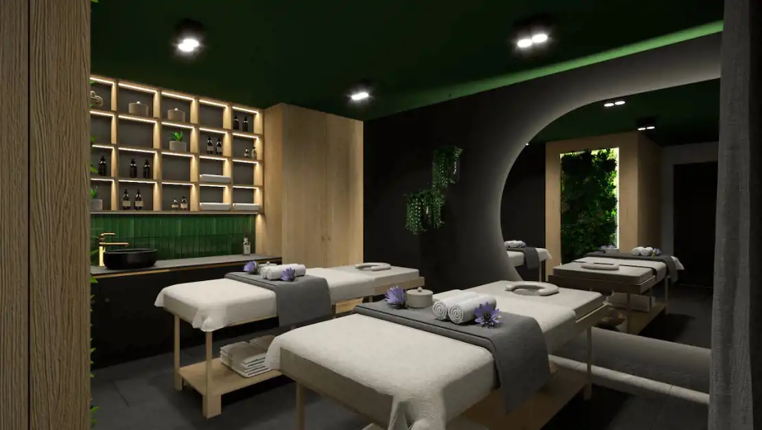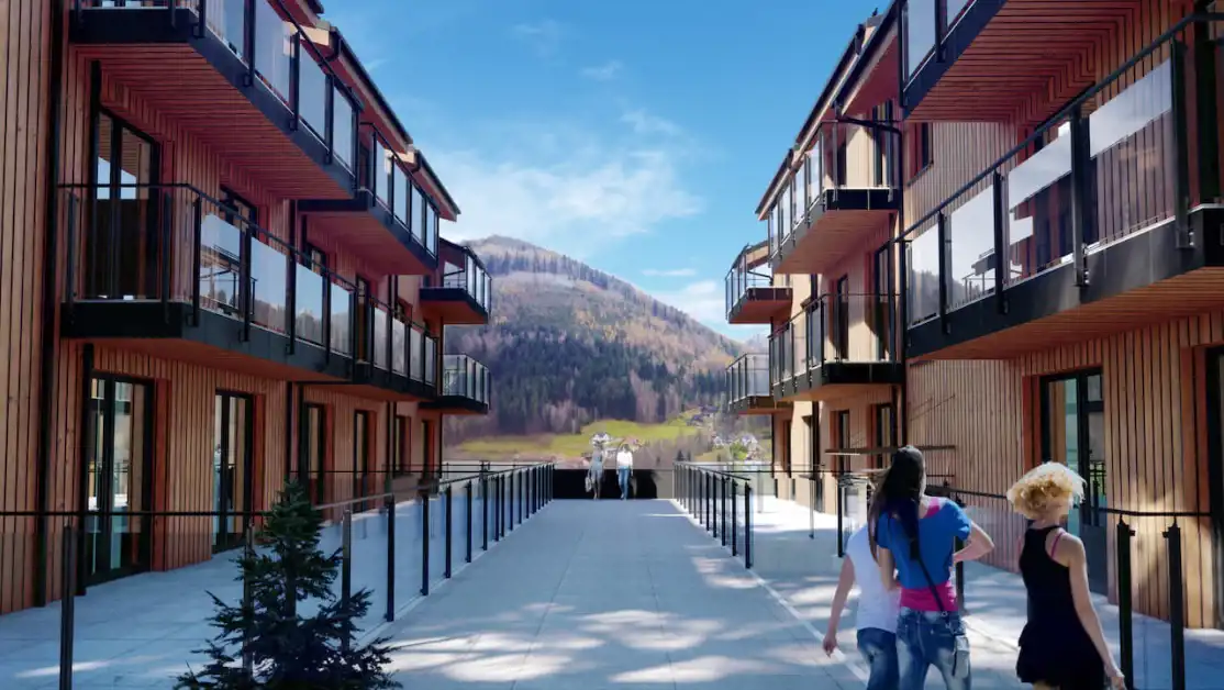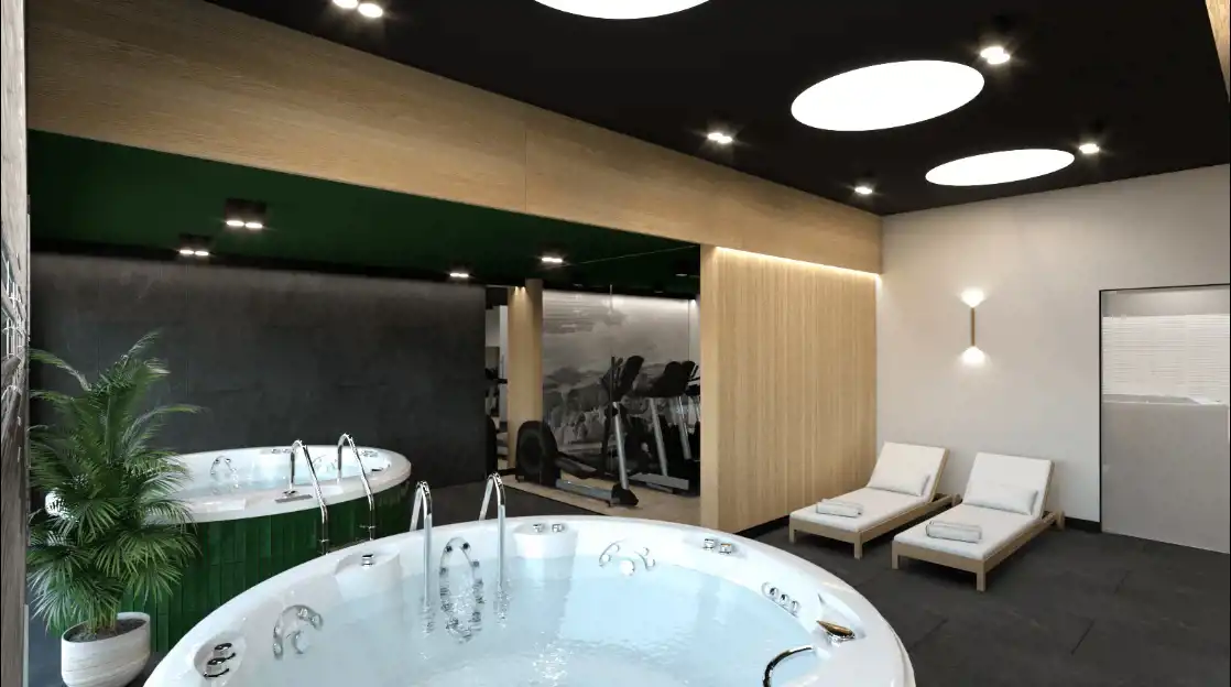 Łącznik pomiędzy dwoma budynkami będzie przeszklony co zapewni piękny widok na góry. W łączniku zaplanowano utworzenie strefy SPA z kompleksem saun, jacuzzi, gabinetem masażu i siłownią.
