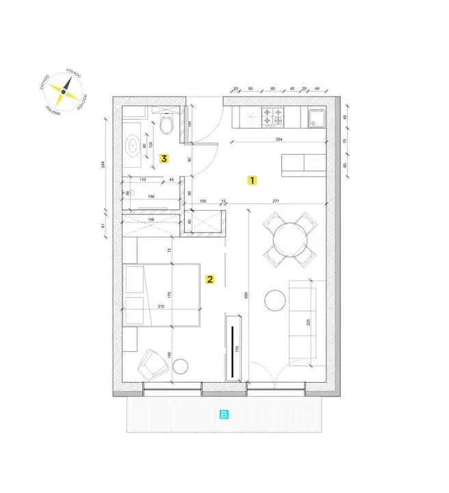 a) salon z aneksem kuchennym (pow. 25,15 m2),
