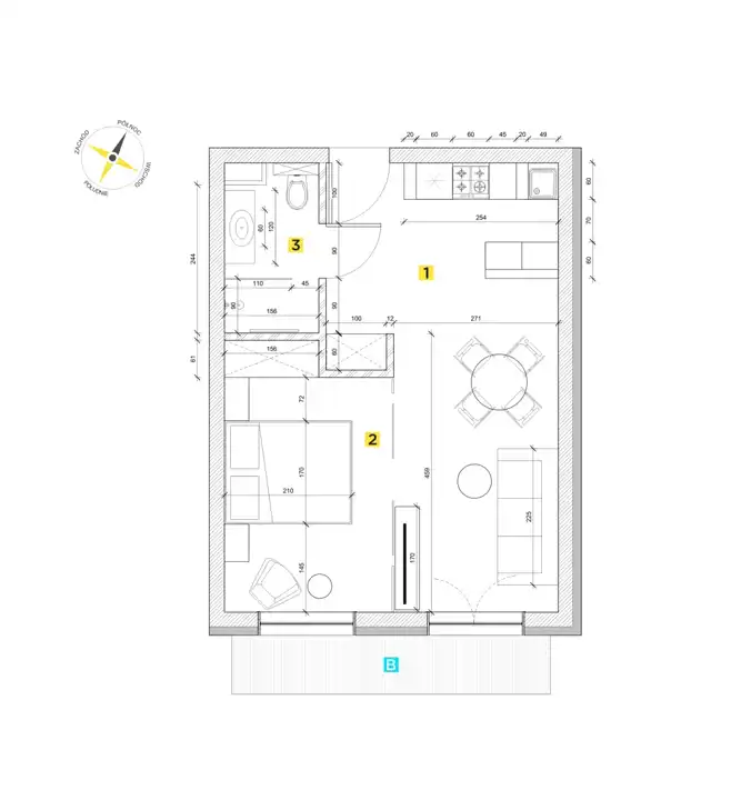 a) salon z aneksem kuchennym (pow. 24,75 m2),
