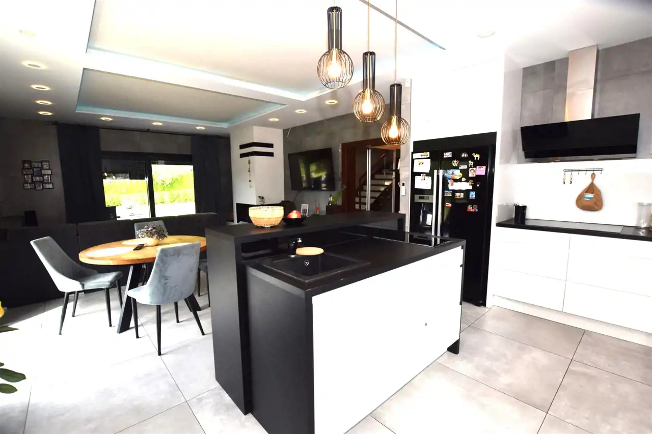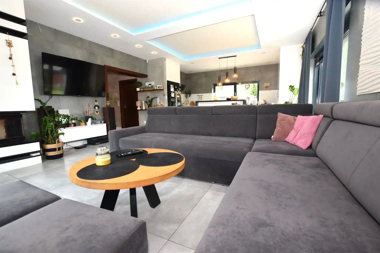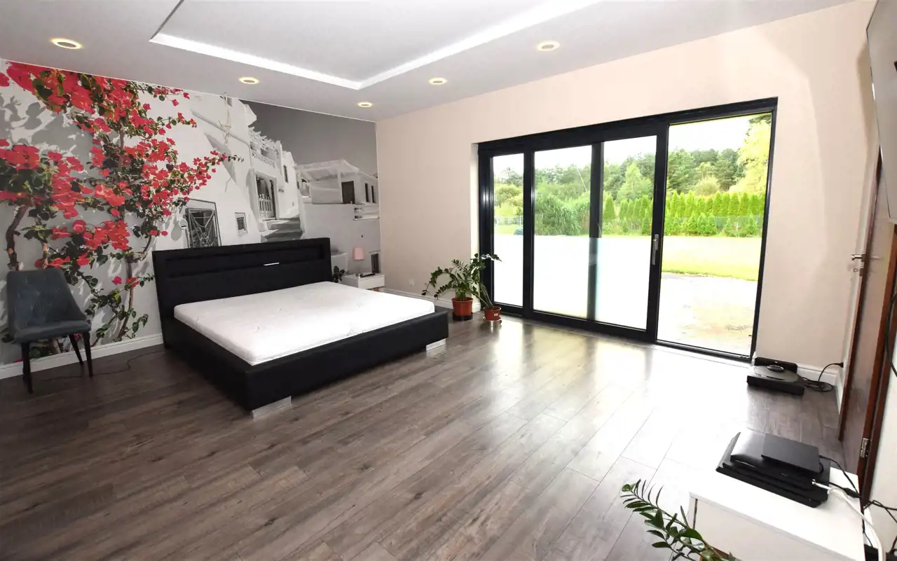 Budynek o powierzchni użytkowej (po odjęciu skosów) 170,53m2, usytuowany na pięknie zagospodarowanej działce o powierzchni 1714m2. Charakteryzuje się wysokim standardem wykończenia przy użyciu materiałów najwyższej jakości oraz dużą dbałością o detale. Całość urządzona z gustem i doskonale się komponująca. Własny ogród, dwustanowiskowy garaż, wykostkowany podjazd i duży taras. W oknach na parterze rolety zewnętrzne. Zamontowany alarm w budynku, monitoring na zewnątrz.
