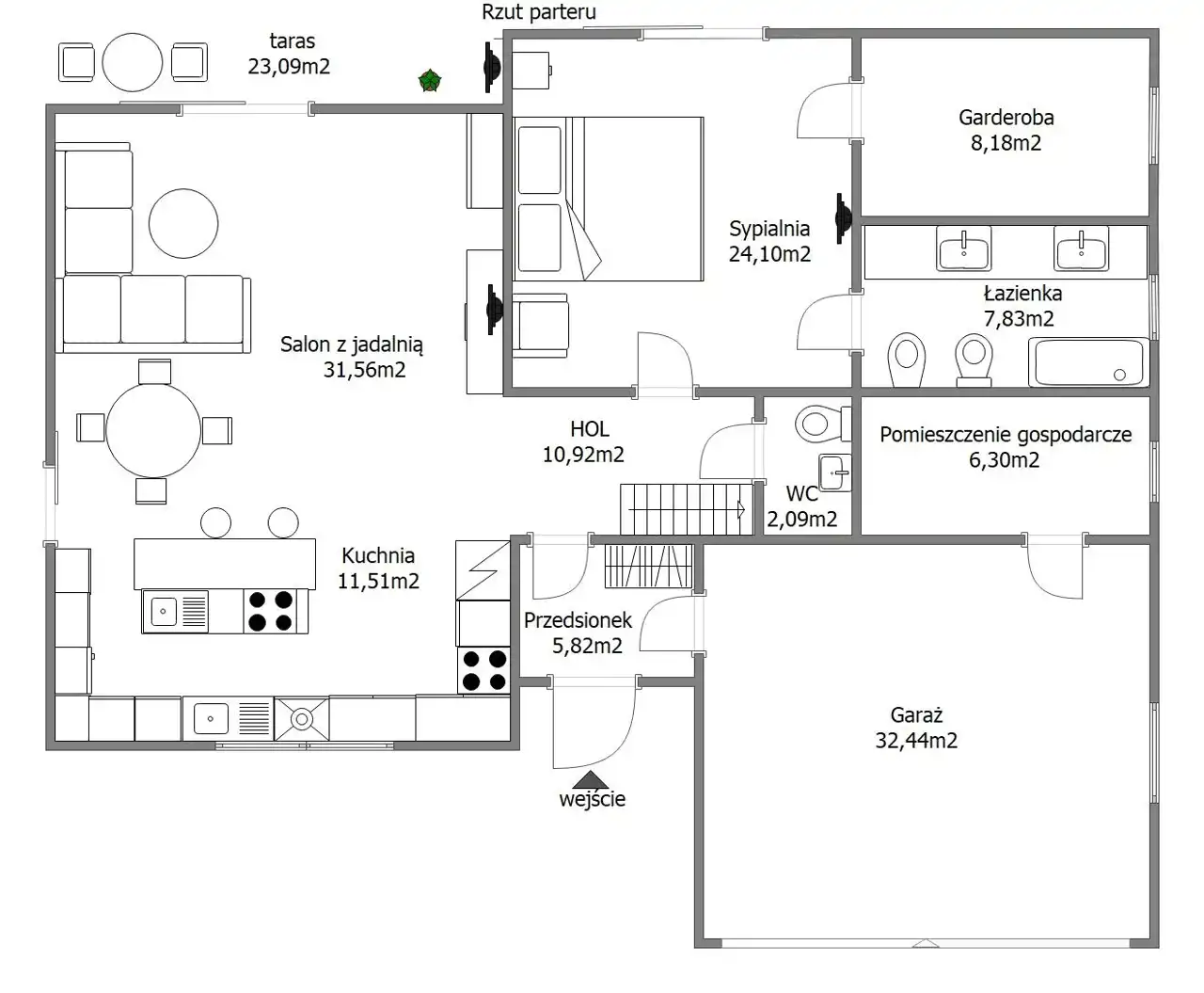 Parter domu składa się z przedsionka, przestronnego salonu z jadalnią i kominkiem z wydzieloną częścią kuchenną i wyjściem na duży taras, sypialni z garderobą, łazienki z WC oraz osobnej toalety, zagospodarowanego, przydatnego pomieszczenia do przechowywania oraz dwustanowiskowego garażu z wejściem bezpośrednio do domu.