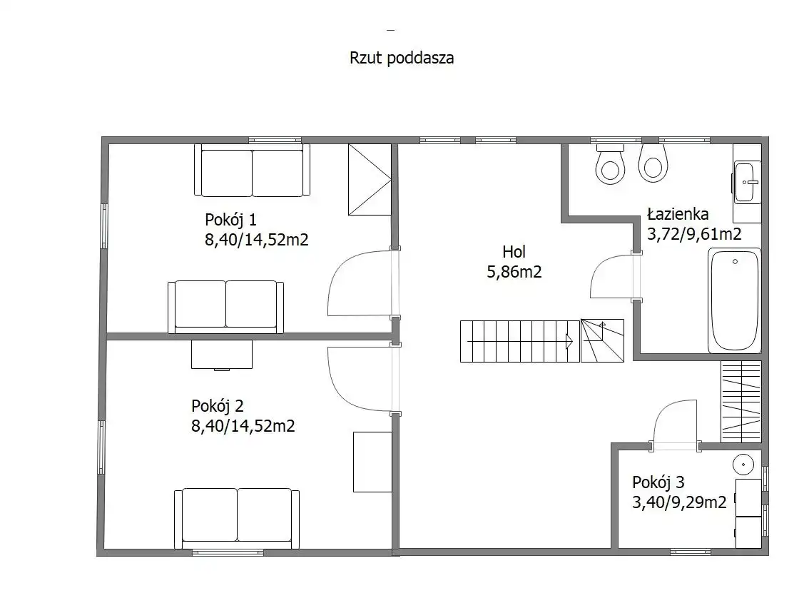 Na górę domu dostaniemy się po wygodnych schodach. Do dyspozycji 3 pokoje oraz kolejna łazienka z oknem.