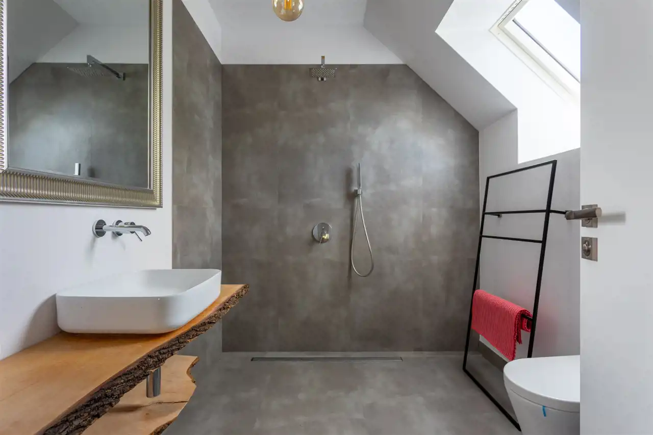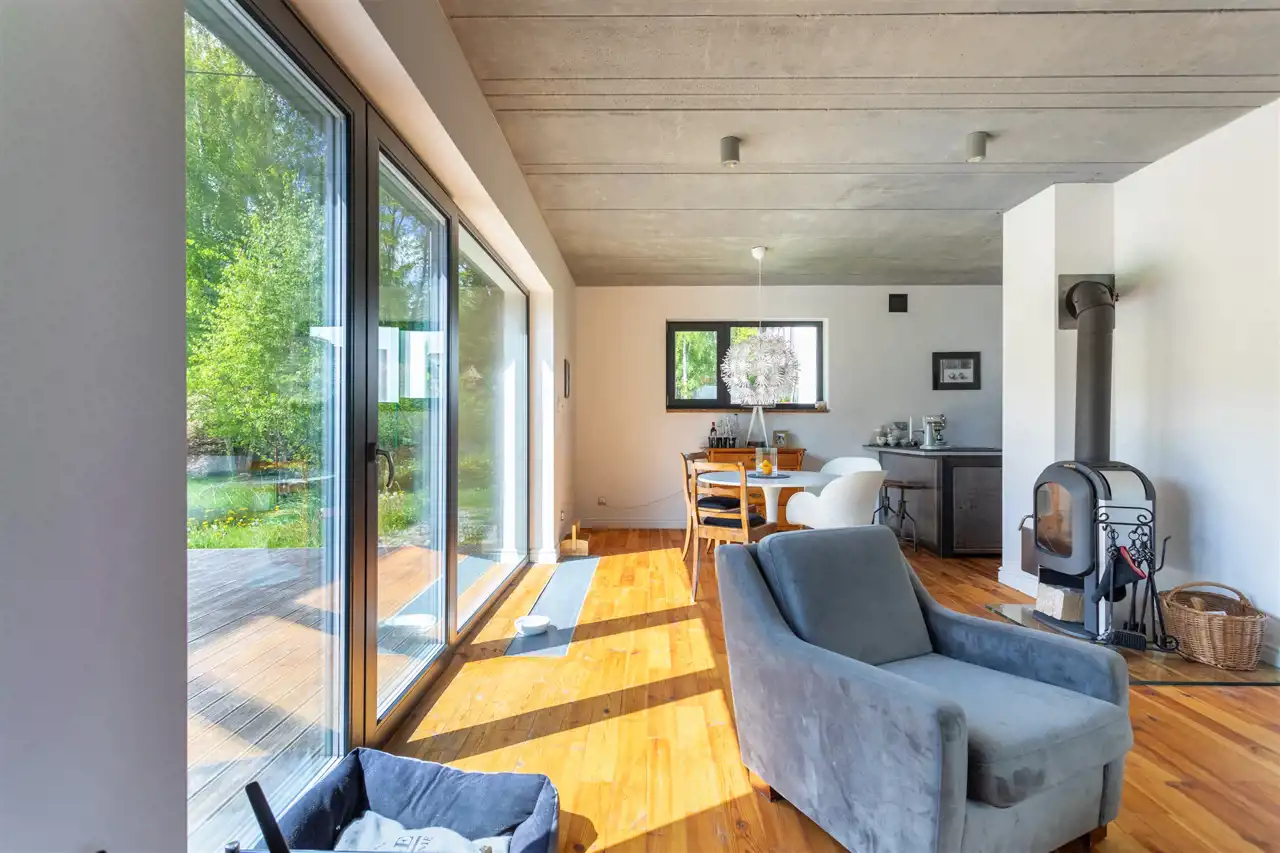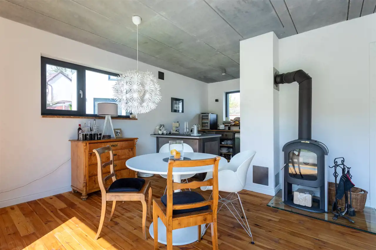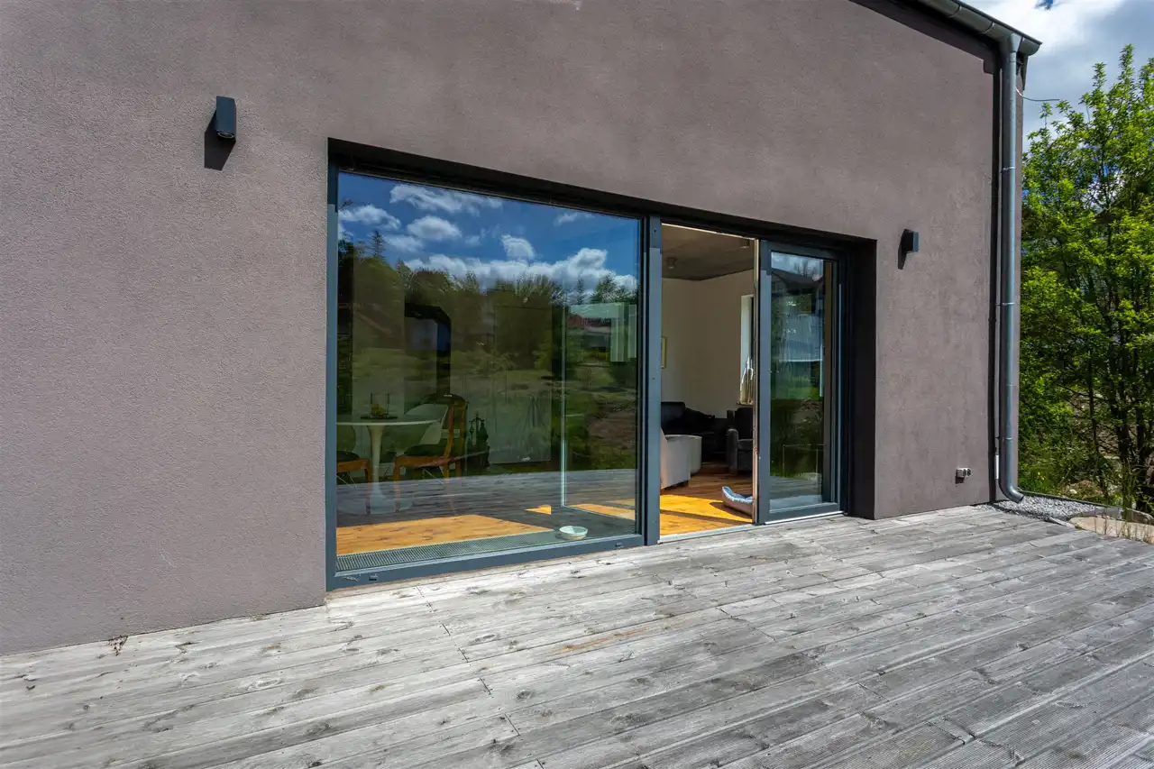 Wnętrze domu zaskakuje dopracowanym designem, który łączy naturalne materiały z surowością betonu i stali, tworząc nowoczesny, ale przytulny klimat. Na parterze znajduje się wiatrołap z ukrytą zabudową do przechowywania, WC, klatka schodowa oraz jasna, otwarta przestrzeń dzienna z aneksem kuchennym i jadalnią. To właśnie tutaj toczy się życie – dzięki dużym przeszkleniom wnętrze jest wypełnione światłem przez cały dzień, a kominek zapewnia ciepło i przytulną atmosferę. Bezpośrednio z salonu wychodzimy na duży taras, który może stać się Twoją prywatną strefą relaksu – z możliwością rozbudowy i aranżacji w stylu mini SPA.