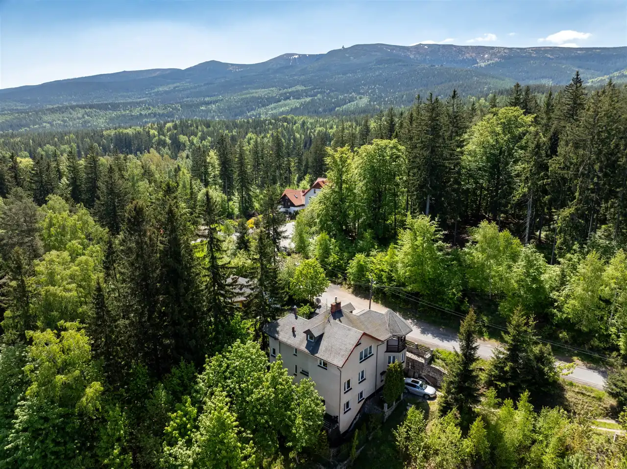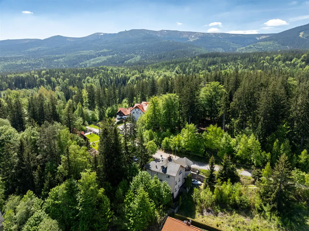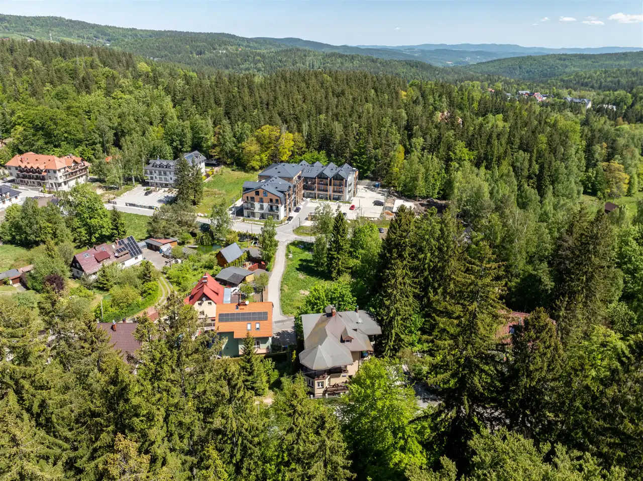 - Z okien, balkonów i tarasów roztacza się przepiękny widok na górskie panoramy, w tym m.in. na Śnieżne Kotły oraz Wysoki Kamień – jedne z najbardziej rozpoznawalnych szczytów Karkonoszy.