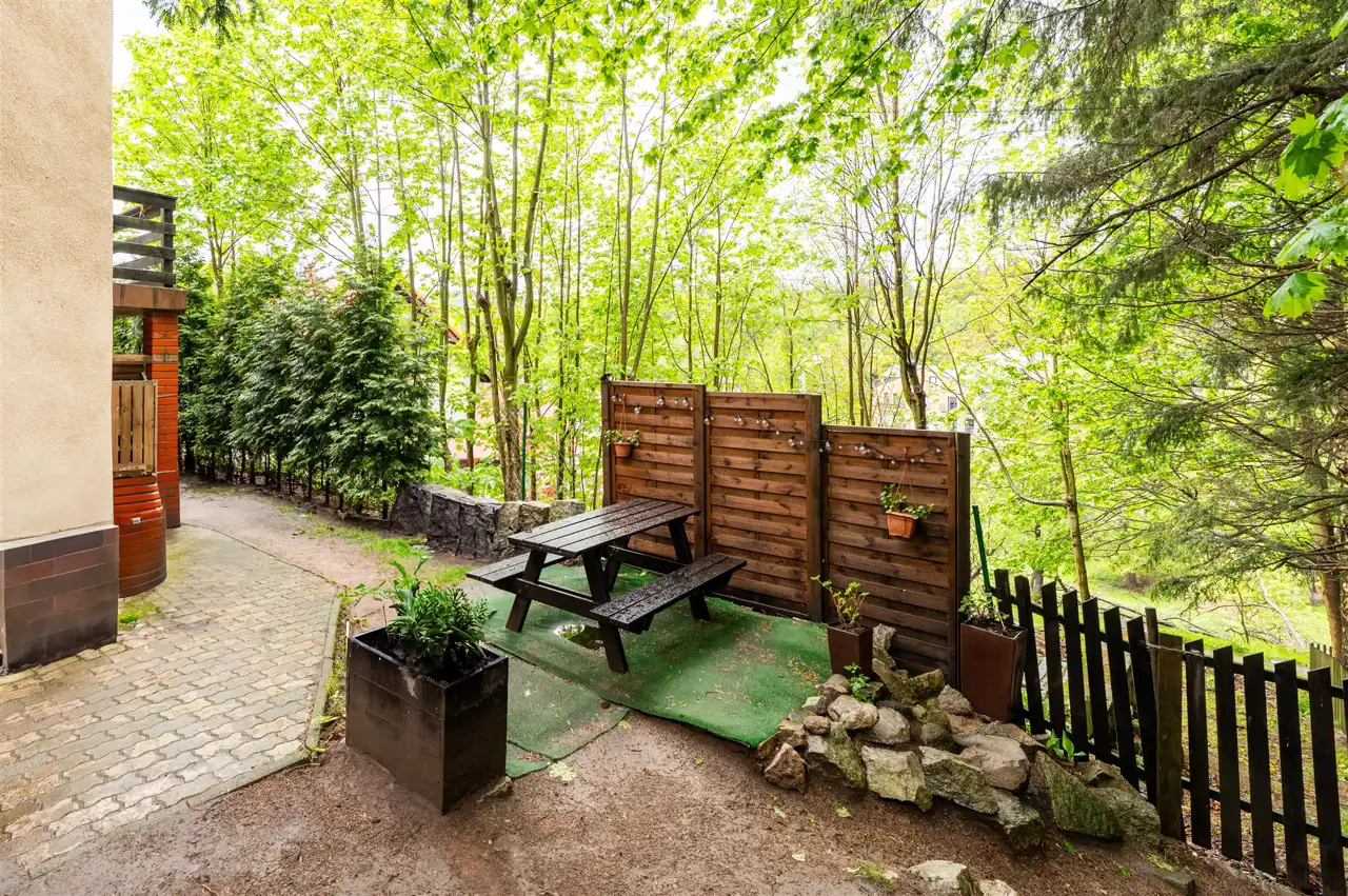 - Do dyspozycji mieszkańców i gości: ogród z wydzieloną strefą relaksu, miejsce do wypoczynku na świeżym powietrzu, a także tarasy i balkony – idealne do porannej kawy z widokiem na góry i las.