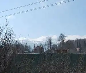 Teren działki porośnięty drzewami owocowymi i krzewami, z pięknym widokiem na panoramę Karkonoszy.