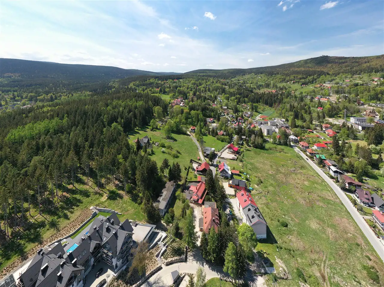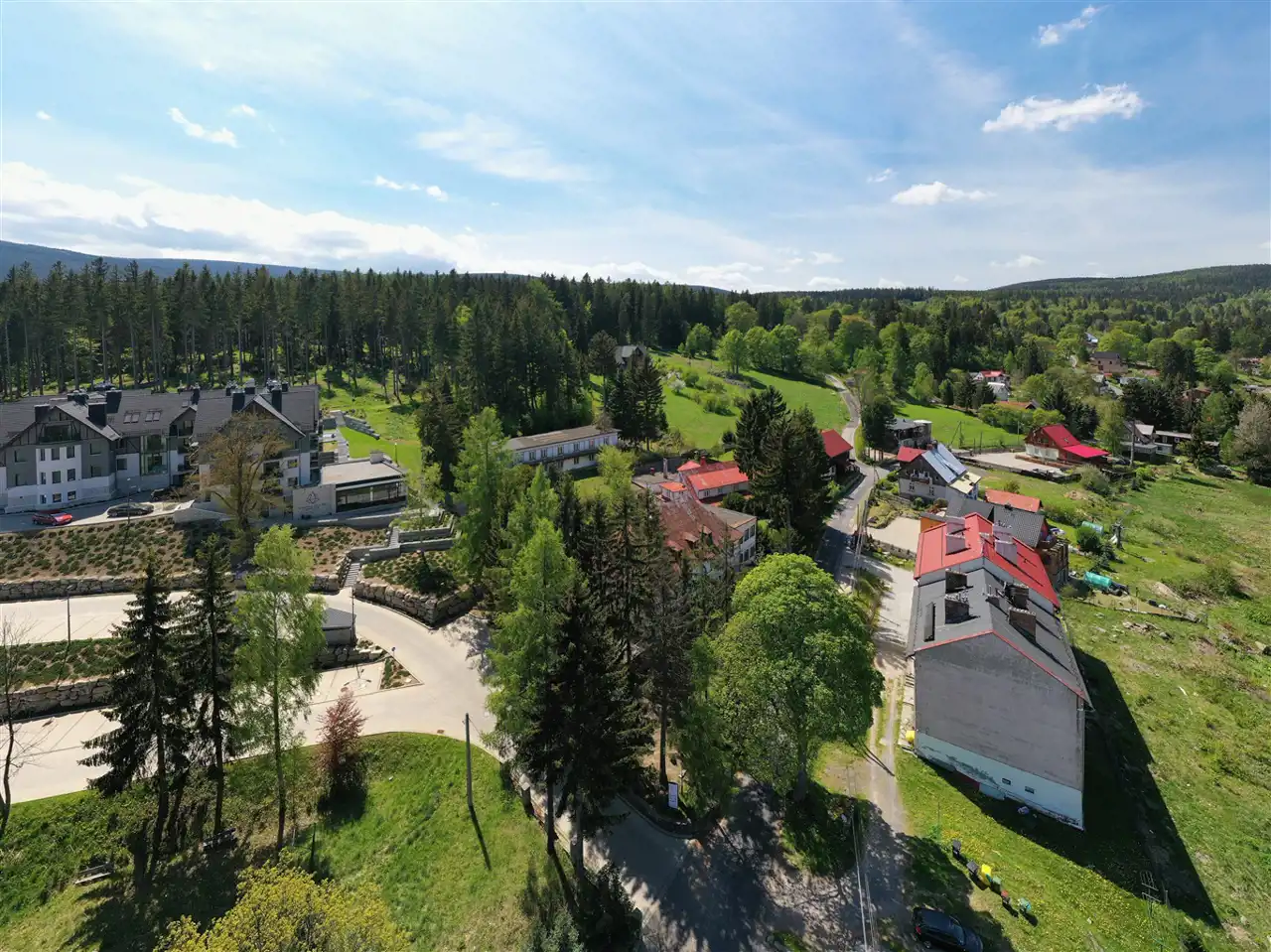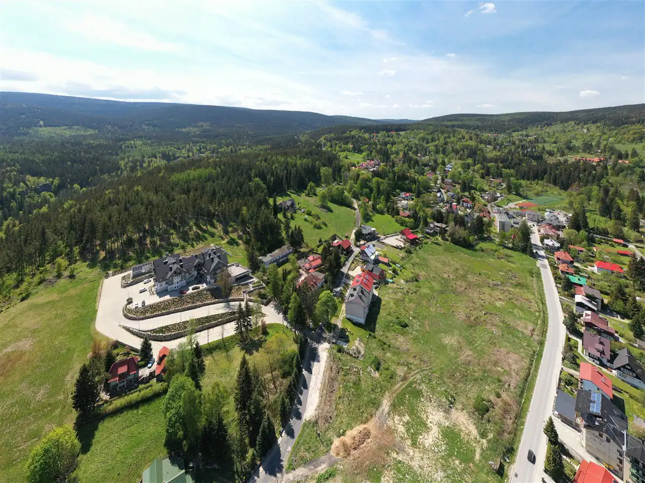 Położenie 750 metrów od centrum Szklarskiej Poręby stanowi o atrakcyjności lokalizacji, dojazd drogą asfaltową oświetloną.