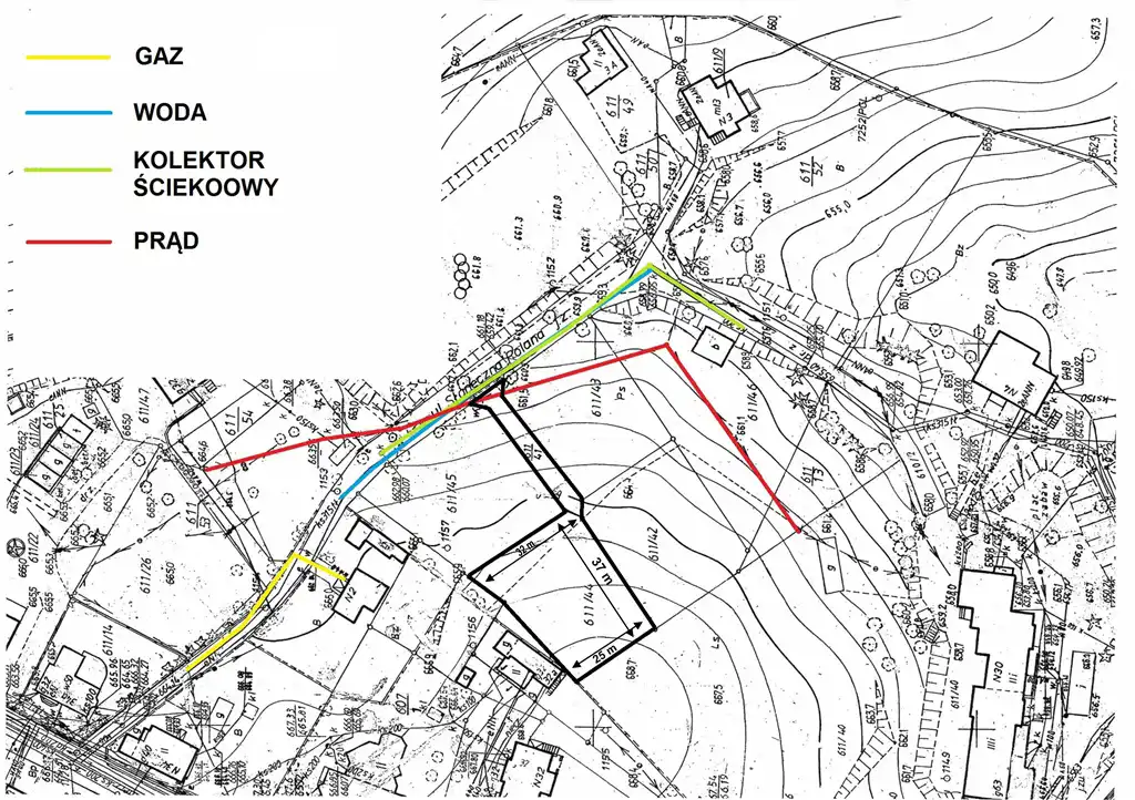 - Media Woda: jest; Kanalizacja: w pobliżu; Prąd: jest; Gaz: w drodze dojazdowej