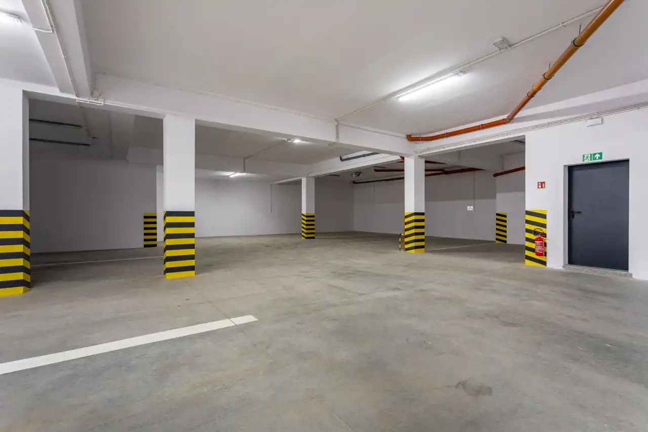 W budynku znajdują się garaże podziemne , winda, narciarnia, rowerownia ,wózkownia