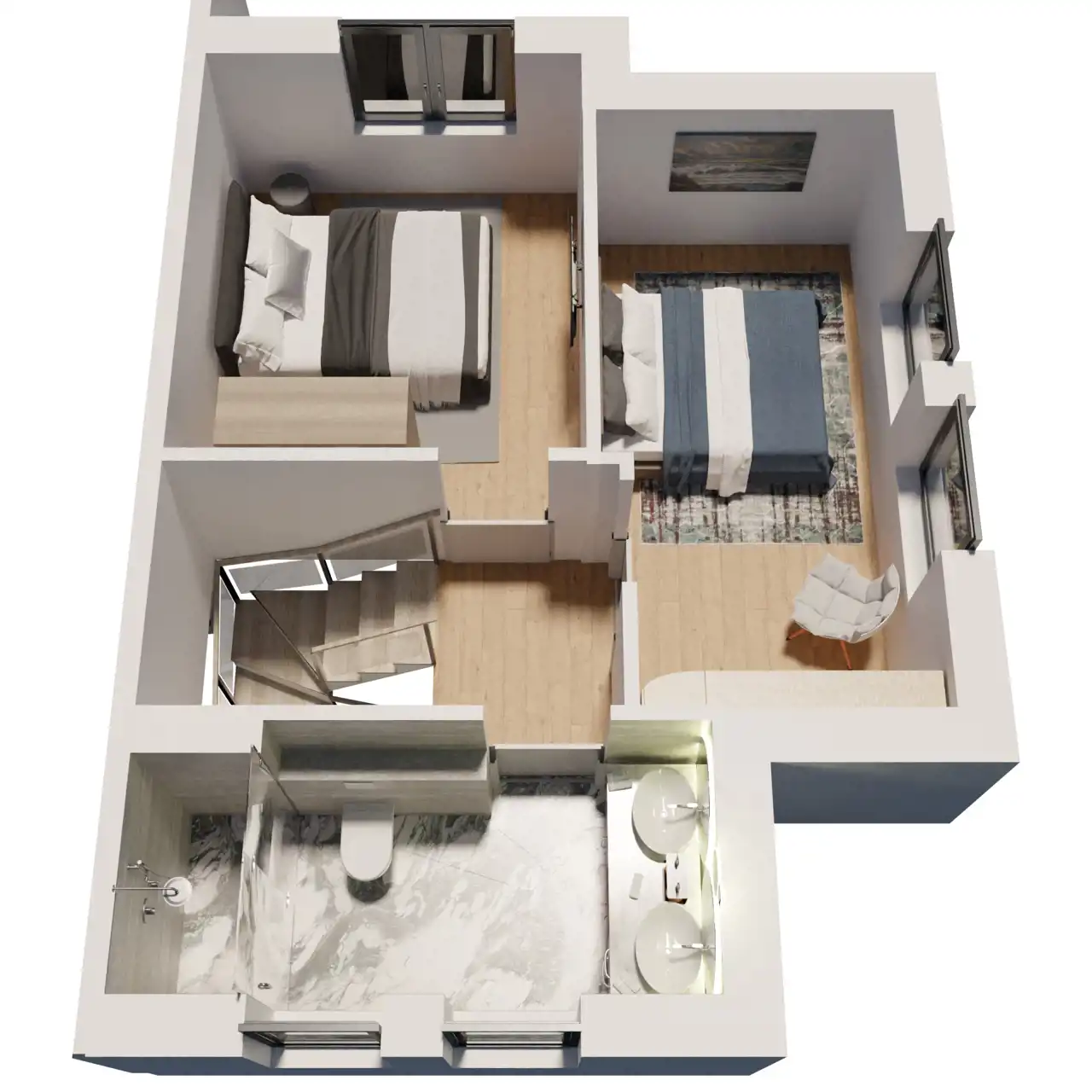 Apartamenty składają się z wiatrołapu, wc, salonu z aneksem kuchennym oraz jadalnią - na parterze. Na piętrze czekają na nas dwie sypialnie, w tym jedna z garderobą oraz duża łazienka. Do każdego lokalu przynależy taras.