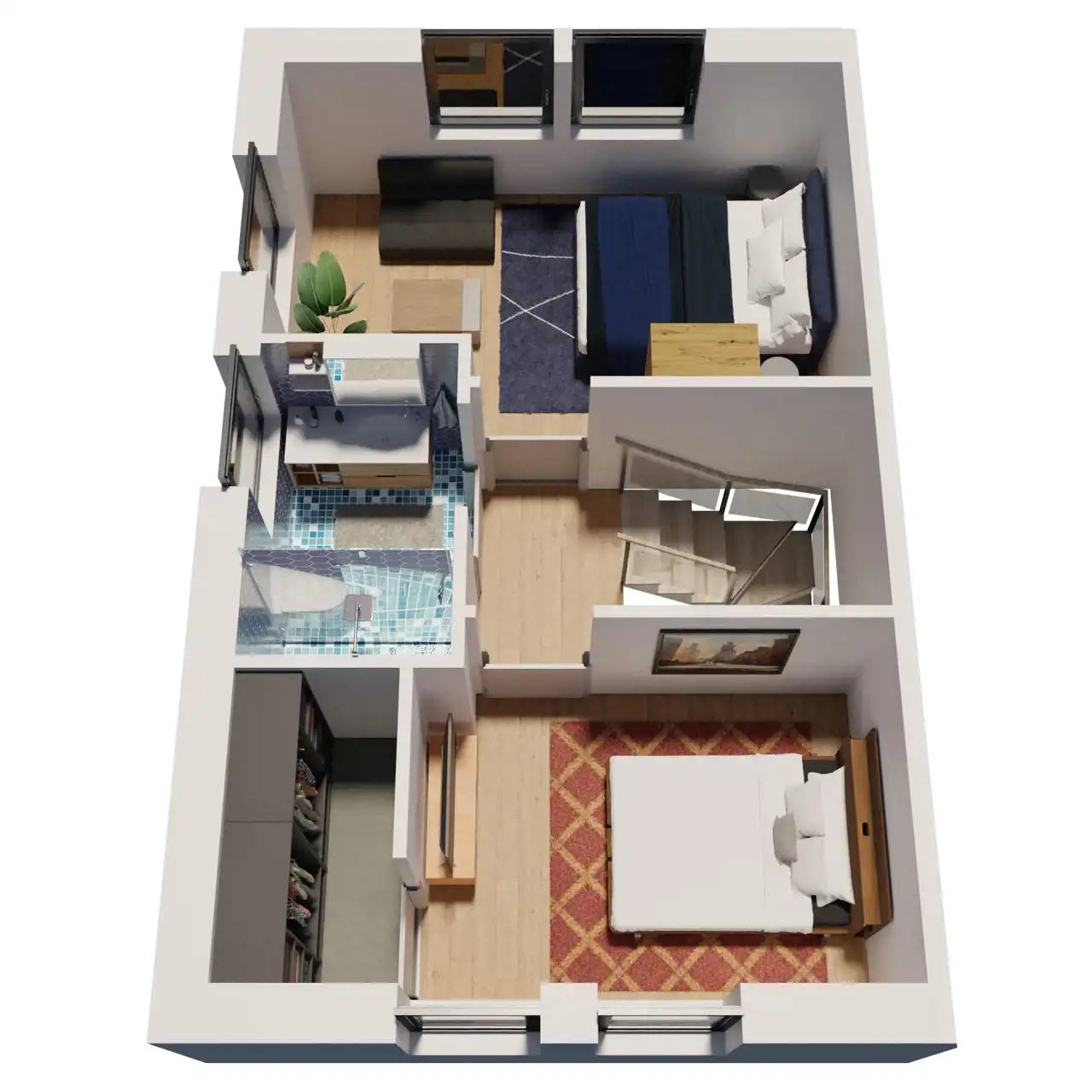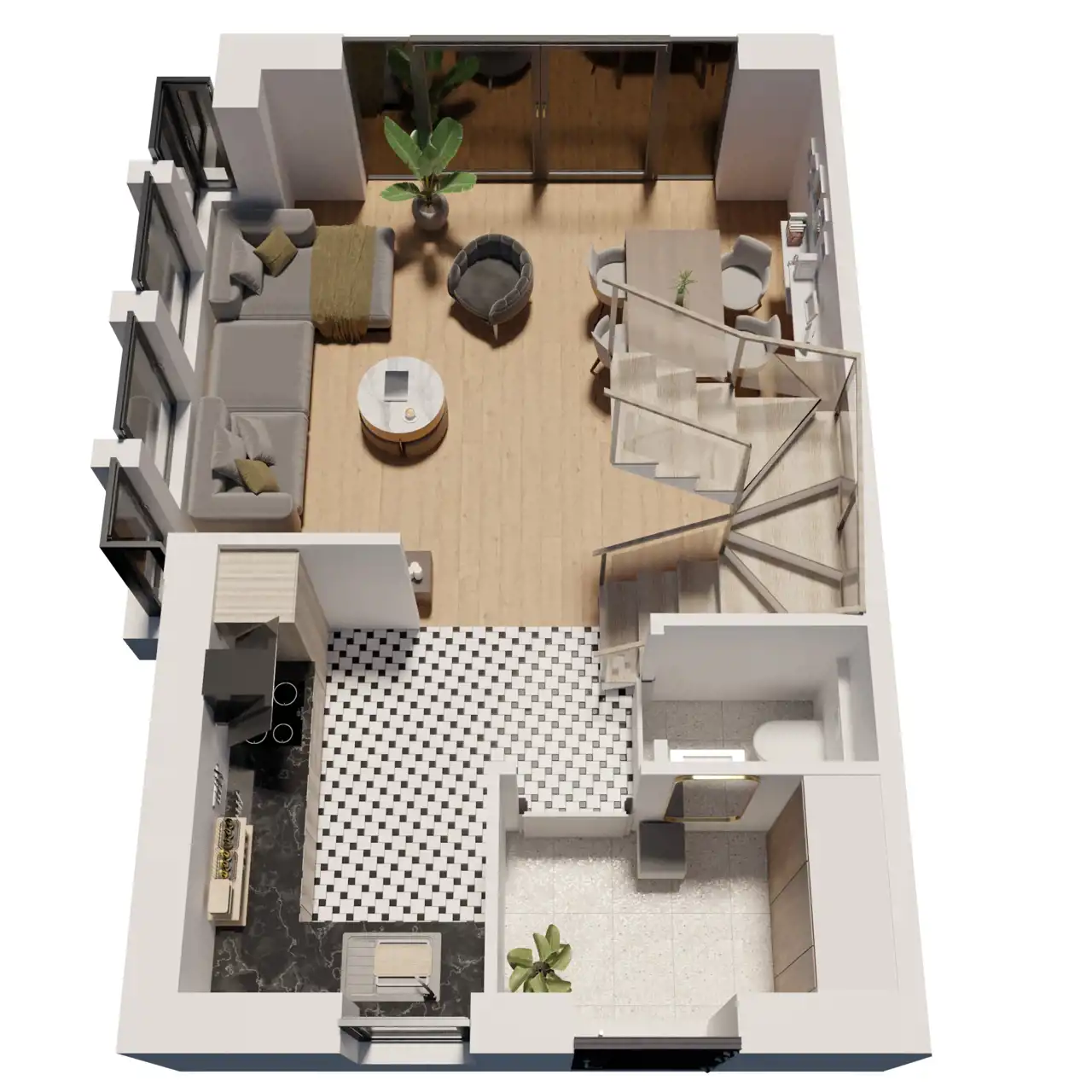 Apartamenty składają się z wiatrołapu, wc, salonu z aneksem kuchennym oraz jadalnią - na parterze. Na piętrze czekają na nas dwie sypialnie, w tym jedna z garderobą oraz duża łazienka. Do każdego lokalu przynależy taras.