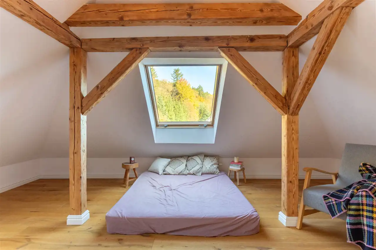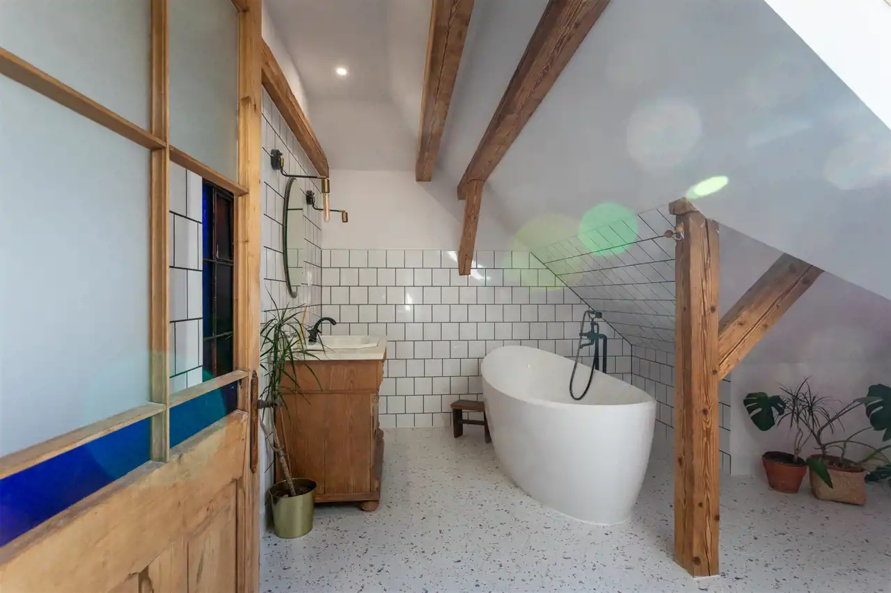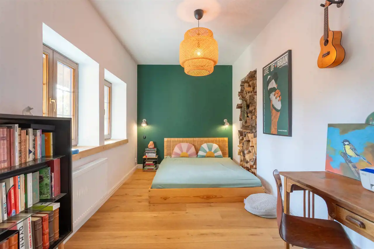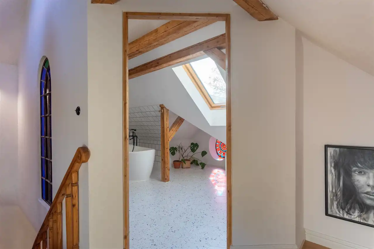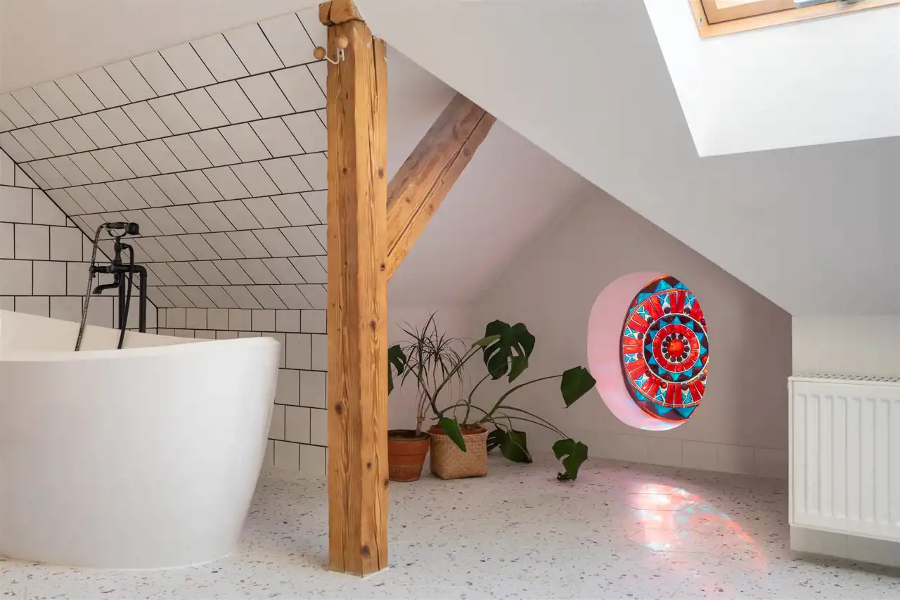 Schody prowadzące na drugi poziom kontynuują stylistykę naturalnego drewna i cegły. Na poddaszu znajduje się druga łazienka – przestronna, jasna, wyposażona w wolnostojącą wannę i ozdobiona pięknym witrażem. Obok znajduje się sypialnia z widokiem na zieleń oraz niewielki pokój, który obecnie pełni funkcję pokoju dziecięcego, choć równie dobrze może stać się domowym gabinetem lub małą czytelnią.