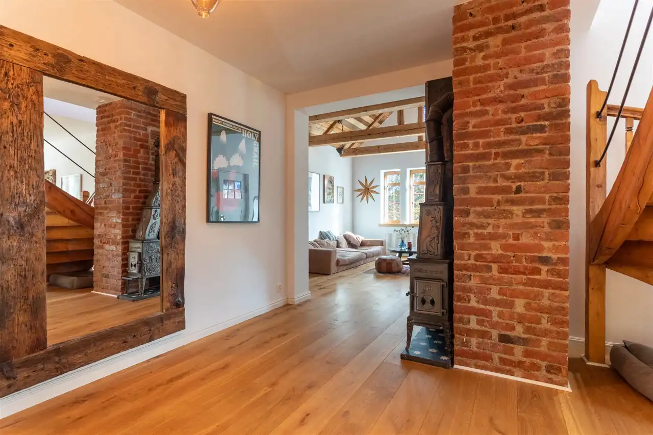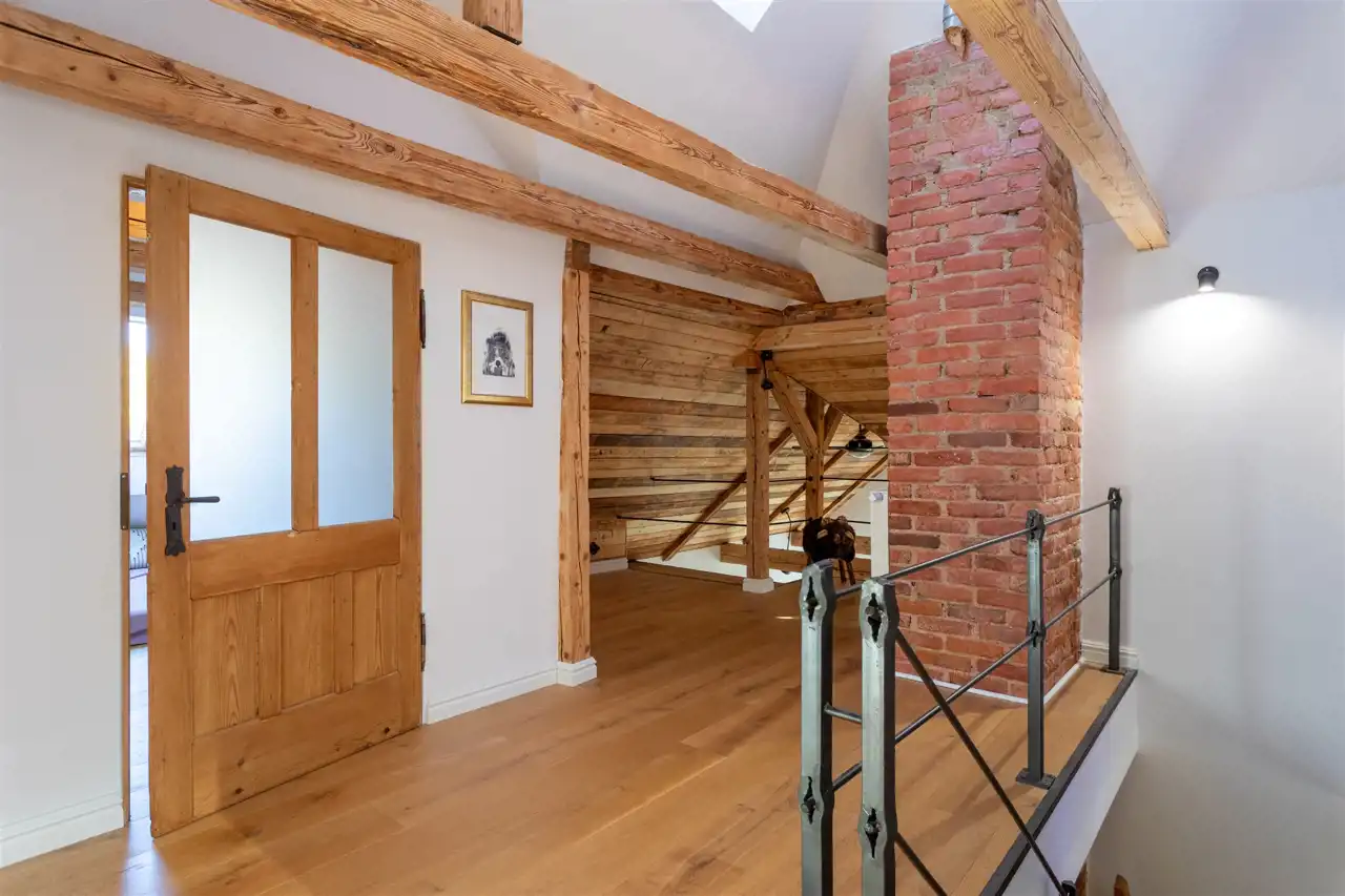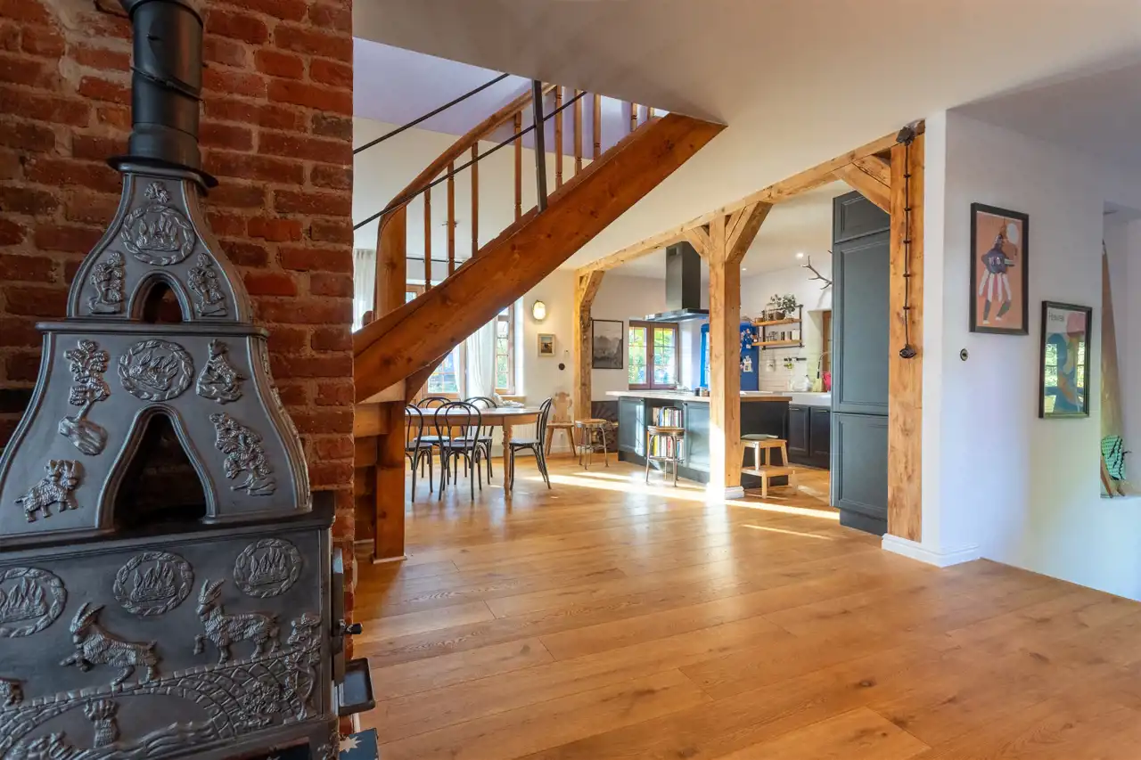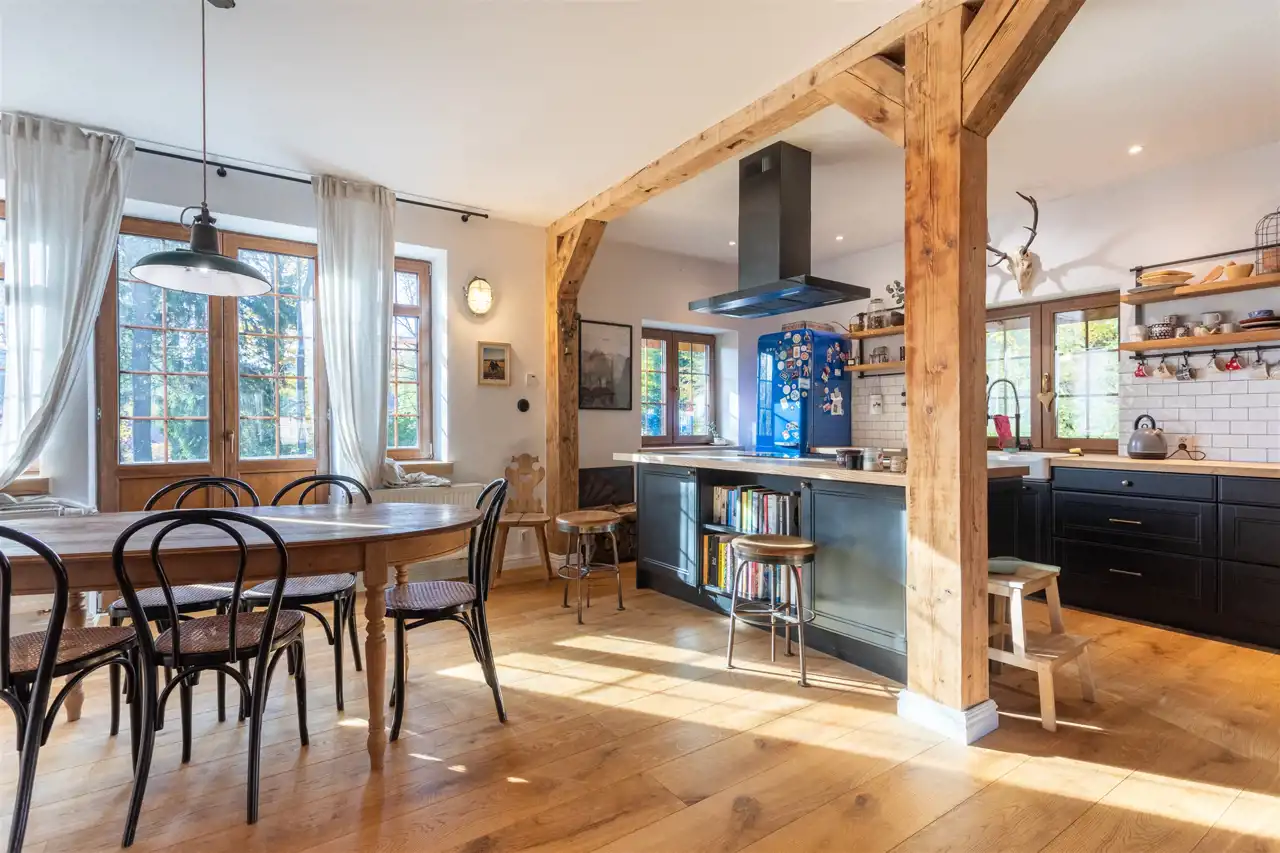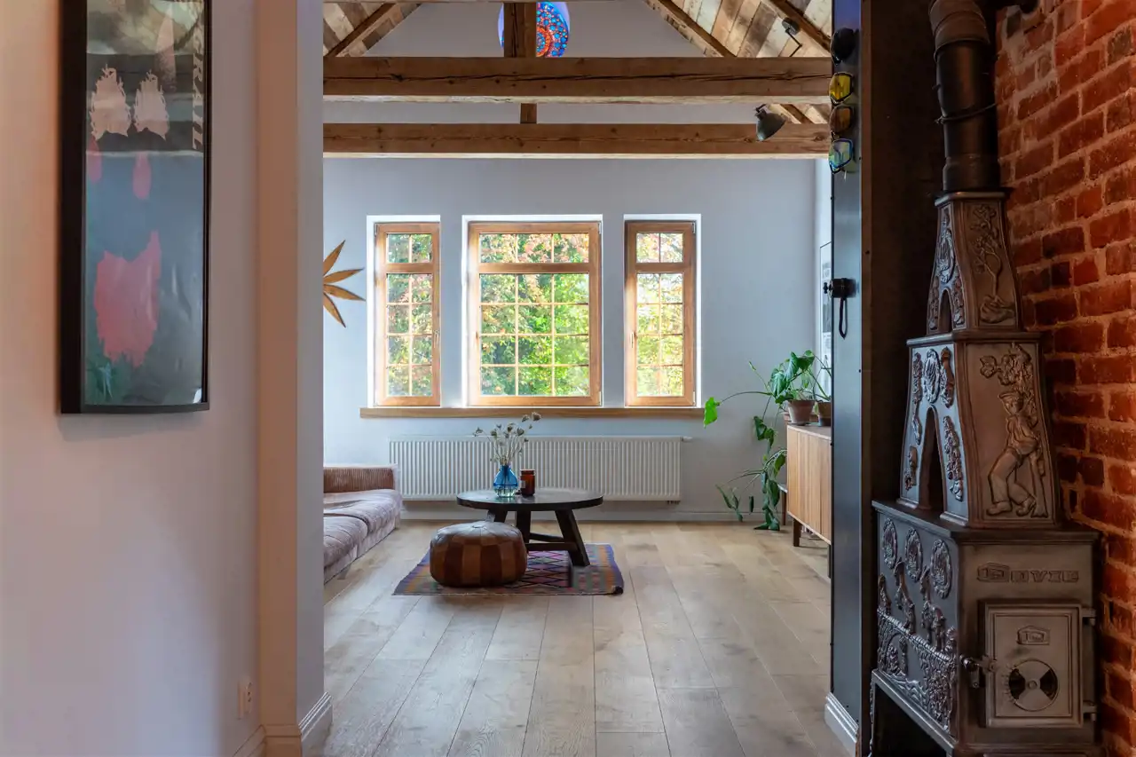 Właściciele podeszli do renowacji z wyjątkową uważnością. Zachowane belki konstrukcyjne zostały odrestaurowane, podobnie jak ceglane fragmenty ścian, stare drzwi z witrażami, drewniane schody oraz liczne detale charakterystyczne dla przedwojennej architektury. Całość dopełniają nowoczesne rozwiązania i wysokiej jakości materiały, które współgrają z historyczną stroną budynku, tworząc unikalny klimat domu z duszą.