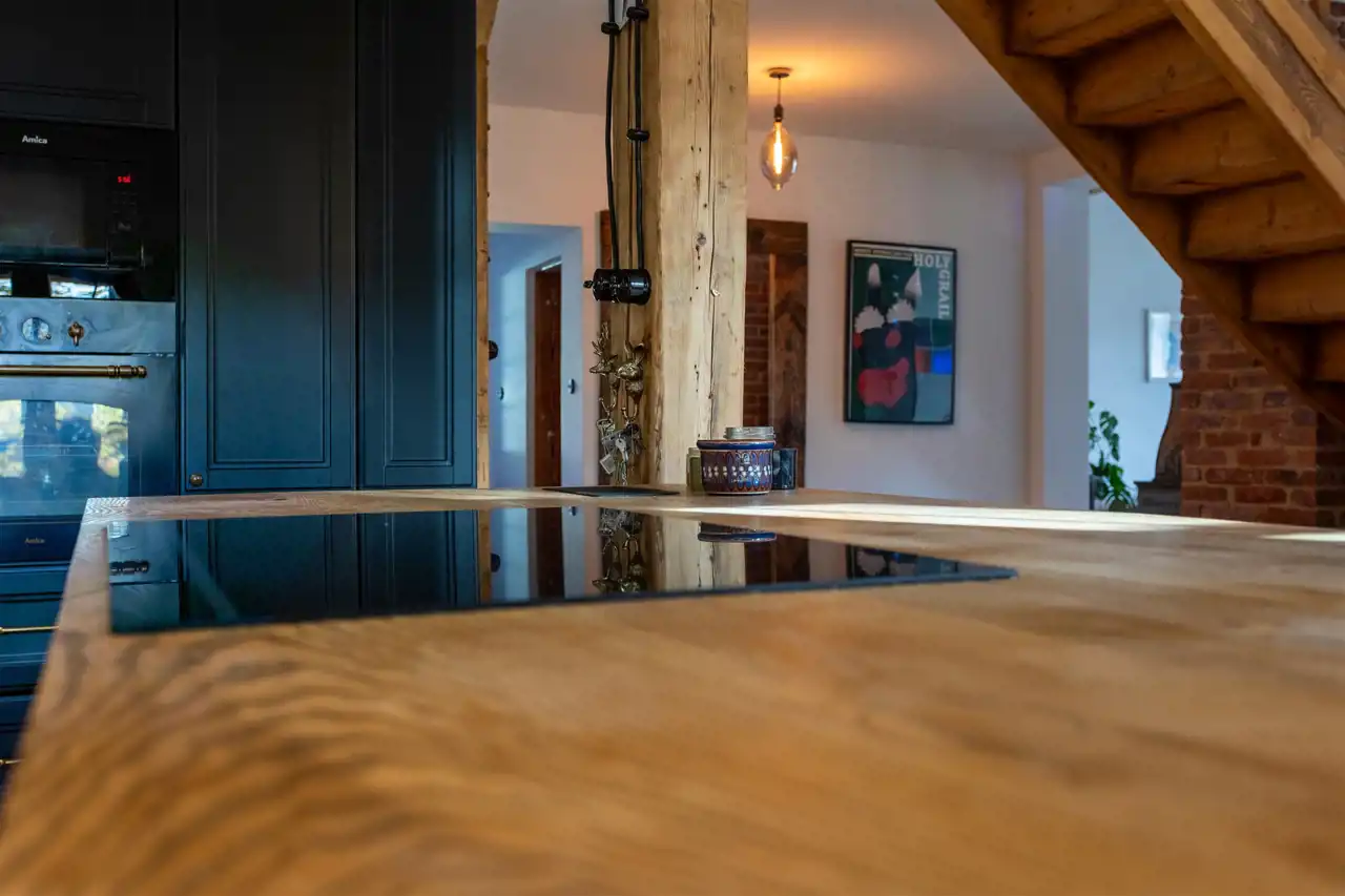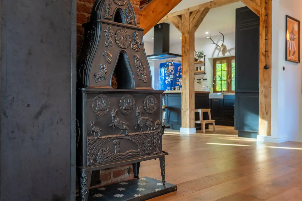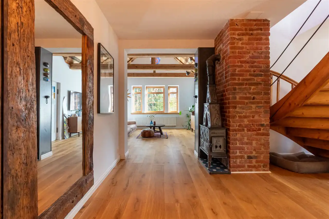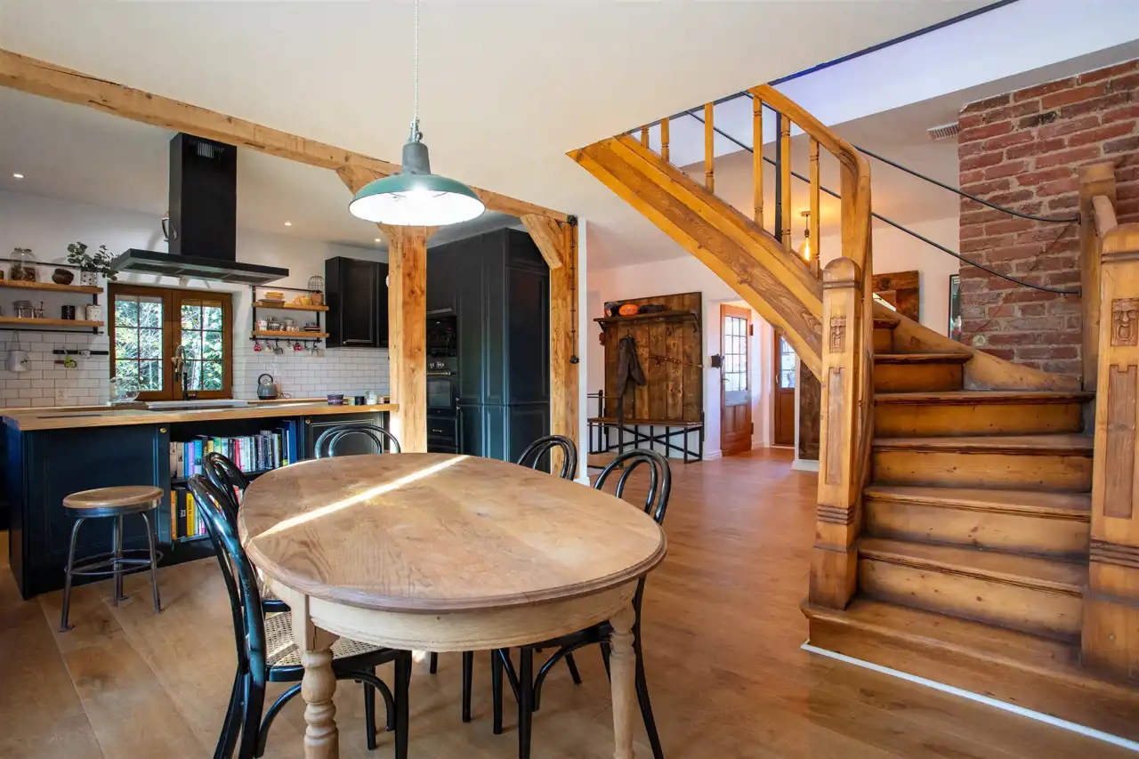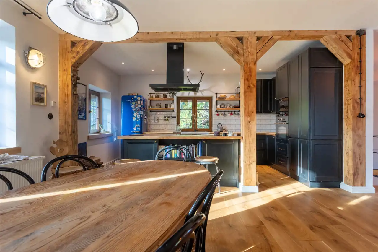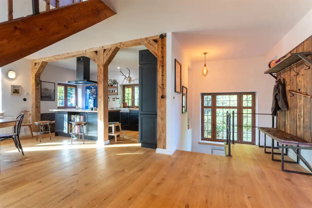 Właściciele podeszli do renowacji z wyjątkową uważnością. Zachowane belki konstrukcyjne zostały odrestaurowane, podobnie jak ceglane fragmenty ścian, stare drzwi z witrażami, drewniane schody oraz liczne detale charakterystyczne dla przedwojennej architektury. Całość dopełniają nowoczesne rozwiązania i wysokiej jakości materiały, które współgrają z historyczną stroną budynku, tworząc unikalny klimat domu z duszą.