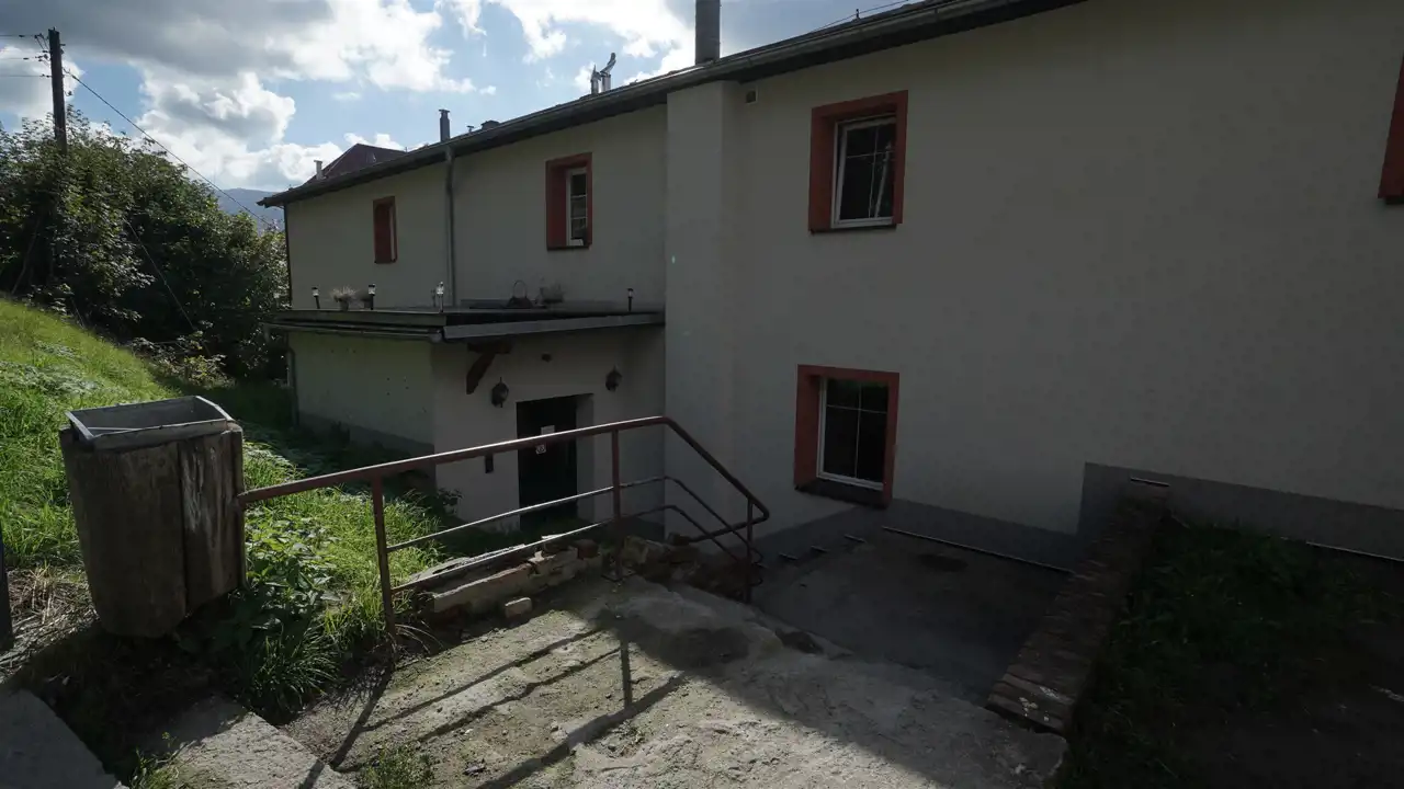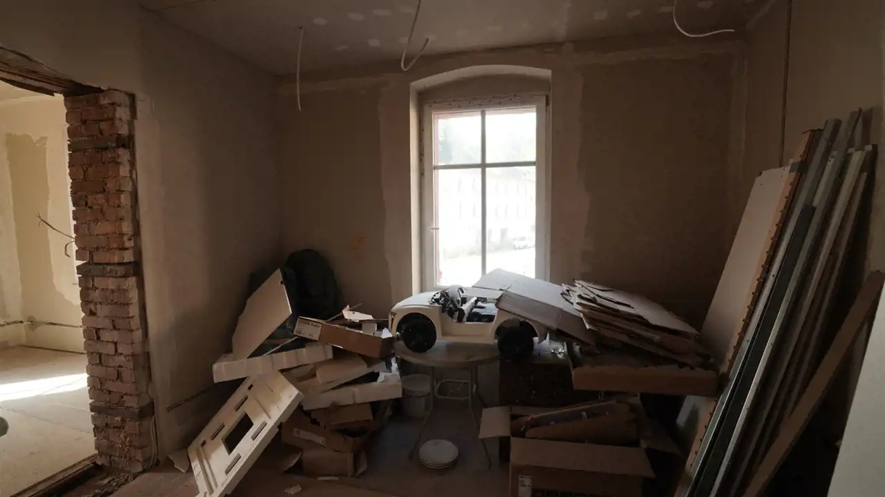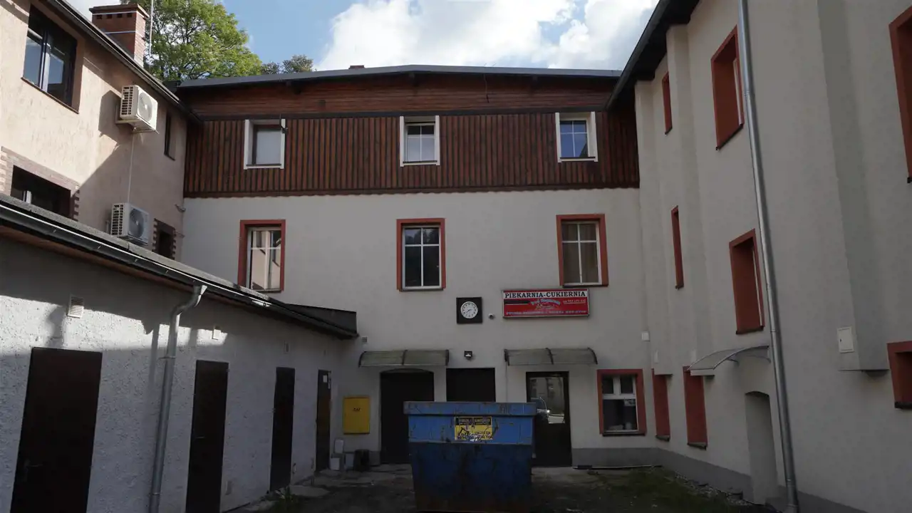 Budynek: elewacja po remoncie, dach po remoncie, klatka schodowa i wejście do budynku z planem remontowym.