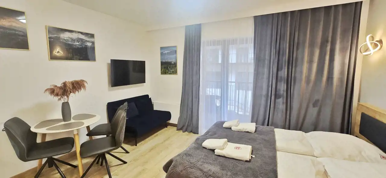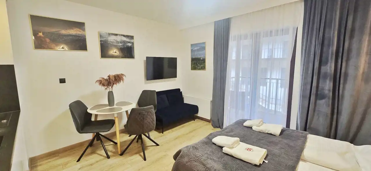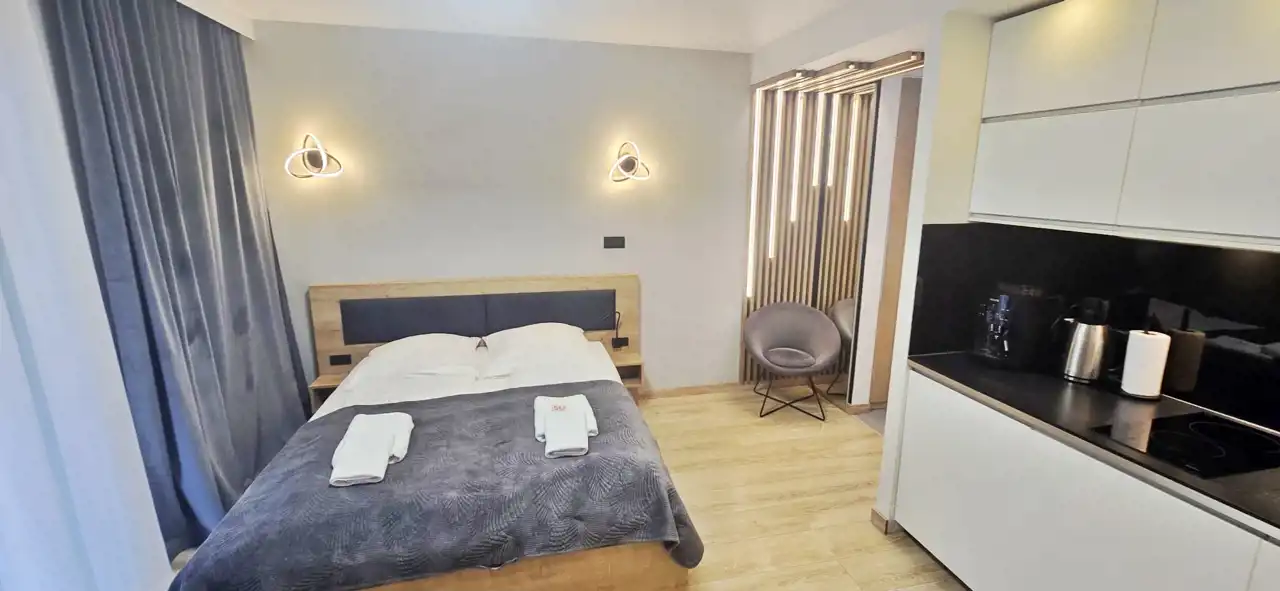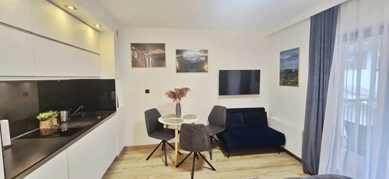 - pokój z aneksem kuchennym z wyjściem na balkon,