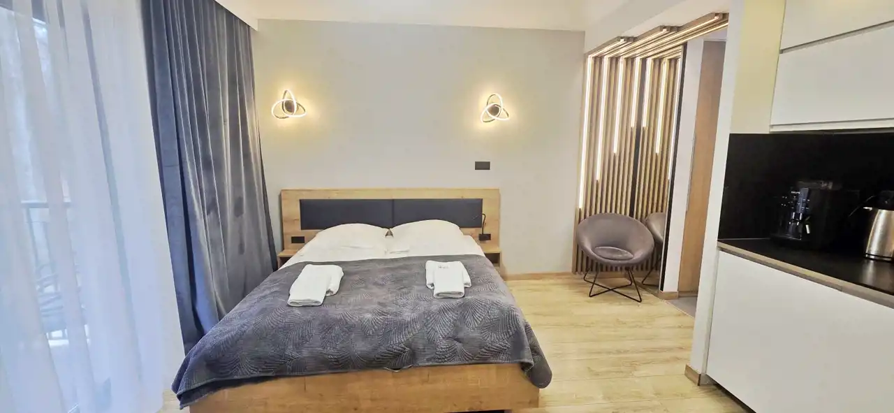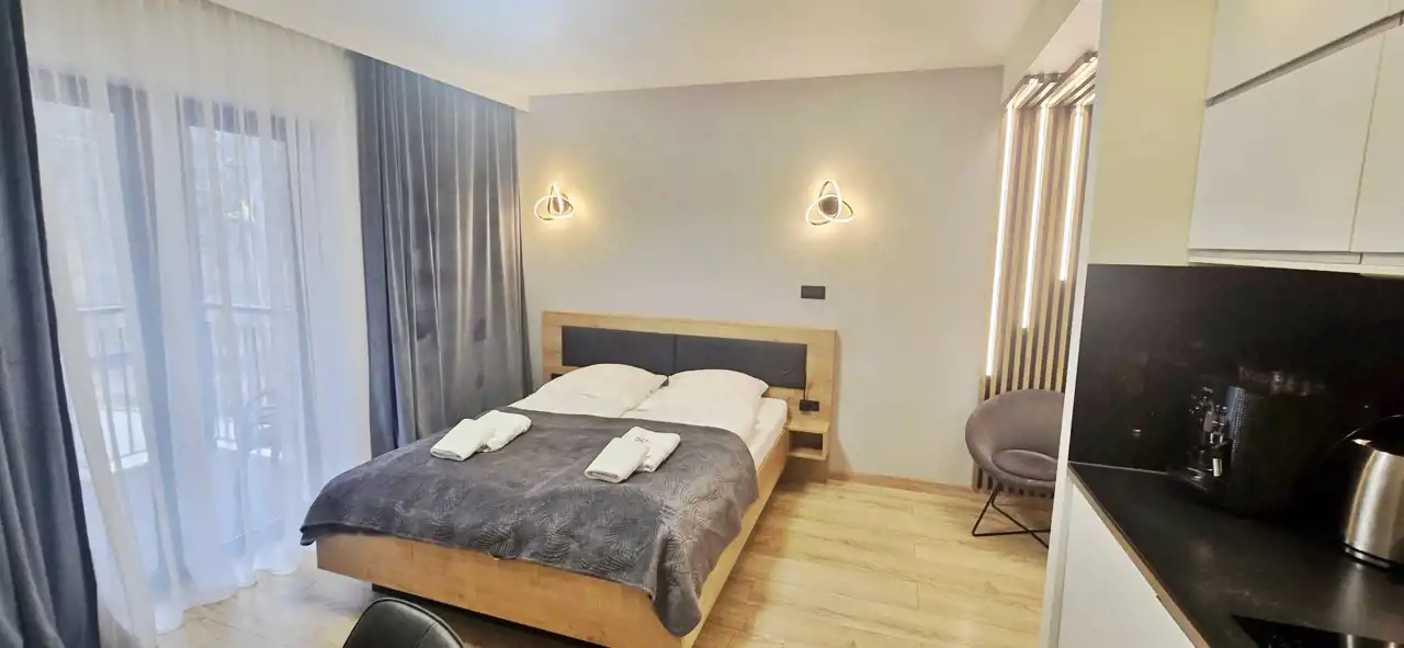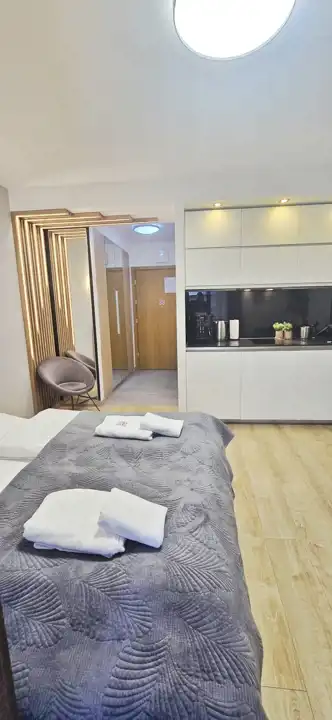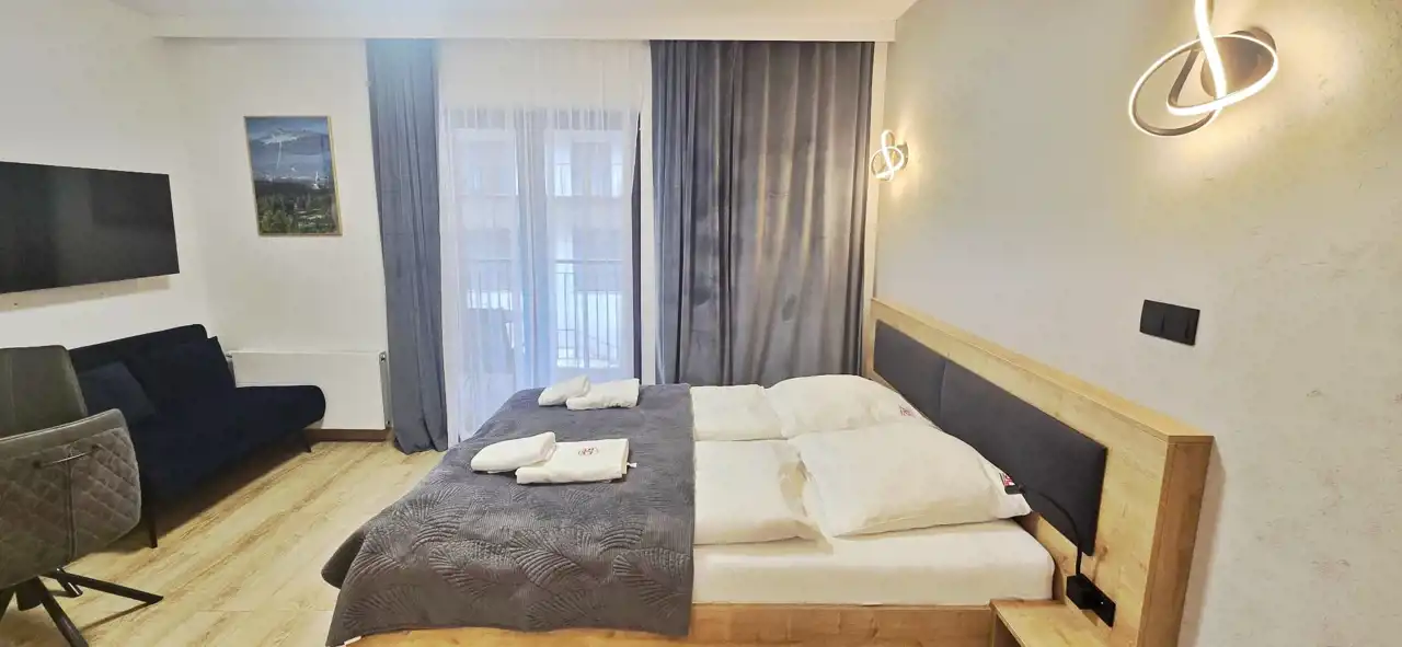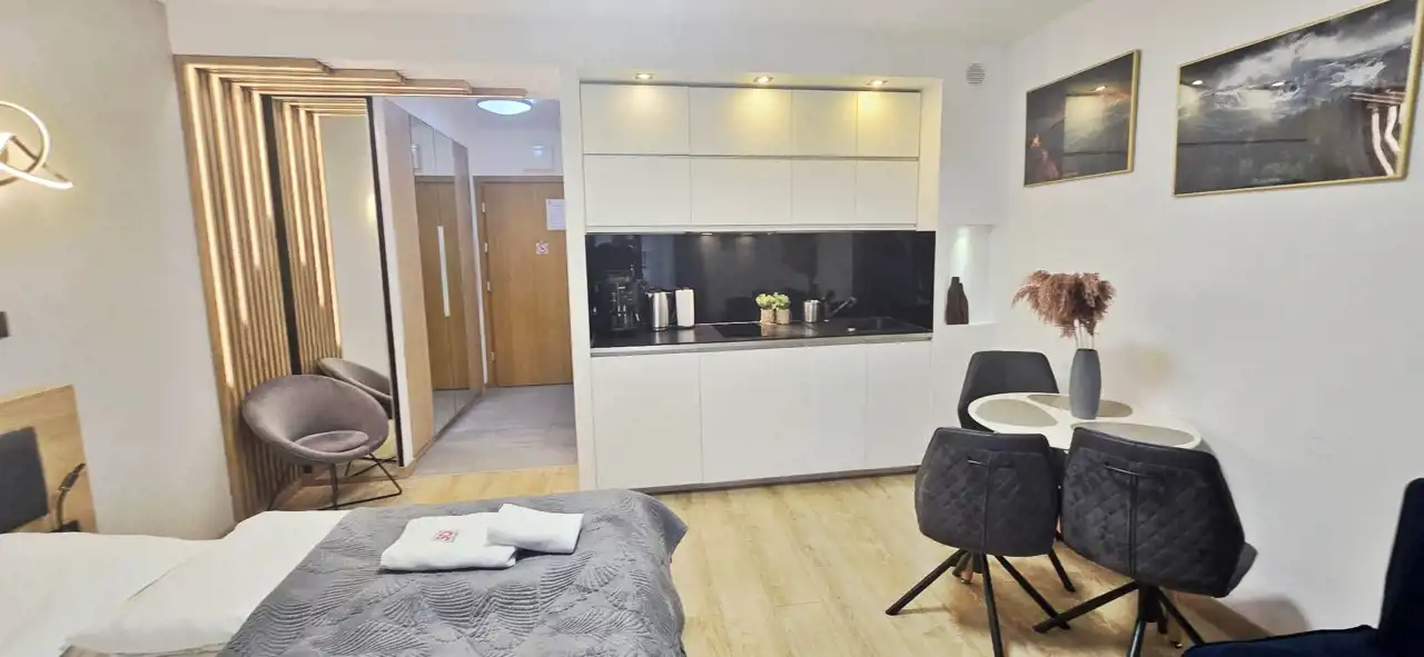 - pokój z aneksem kuchennym z wyjściem na balkon,